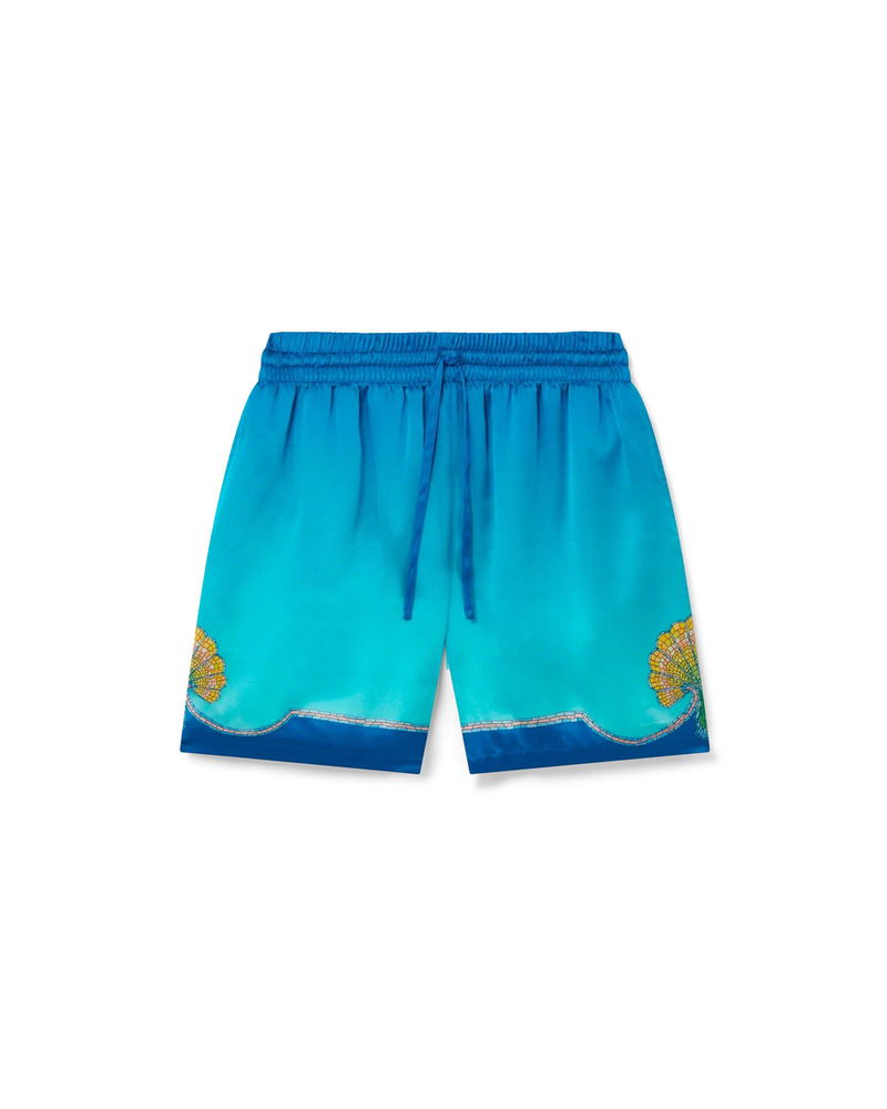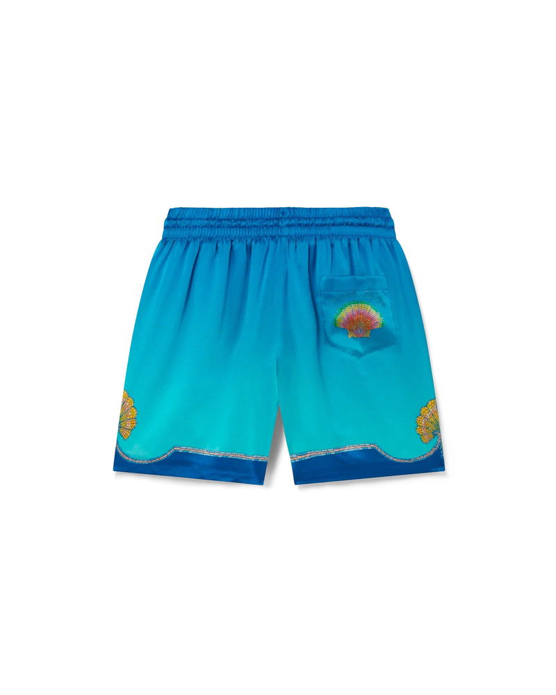 The Coquillage Coloré silk shorts are a short style with an all-over print featuring the gradient mosaic rainbow shell on a familiar blue ombre silk twill fabric. Completed with an elasticated waistband, drawstring fastening, side pockets, a back pocket, and contrast hem detail. Printed silk twill fabric 100% silk Coquillage Coloré print Specialised dry clean only Made in Italy Fits true to size, take your regular size The model is 187cm/6'1 and is wearing a size M Coquillage Coloré Silk Shorts in Blue, Size XXS by Casablanca Paris