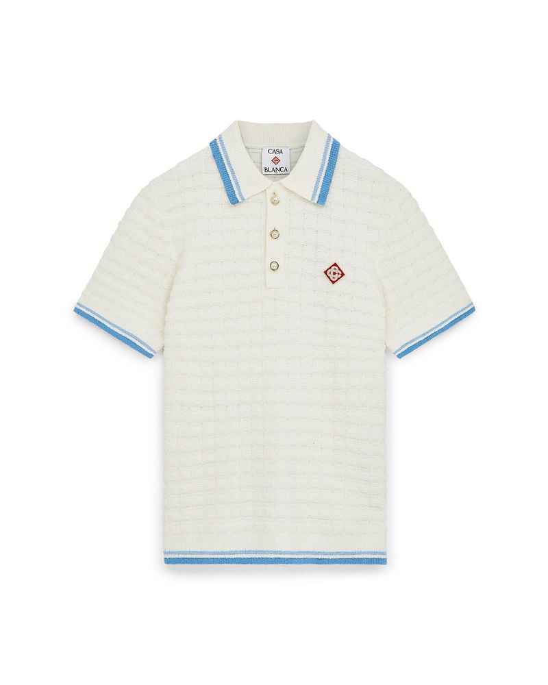 The boucle short-sleeve polo is a classic design crafted from cotton boucle fabric featuring the house's signature diamond logo. Completed with signature gold rim pearl buttons, a rib collar, cuffs, placket, and hem. Cotton boucle fabric Main: 79% cotton 20% nylon 1% elastane Applique: 95% viscose 5% polyester Colour: white Delicate machine wash Made in China Slim fit The model is 187cm/6'1 and is wearing a size M Cotton Boucle Polo Shirt, Size XS by Casablanca Paris
