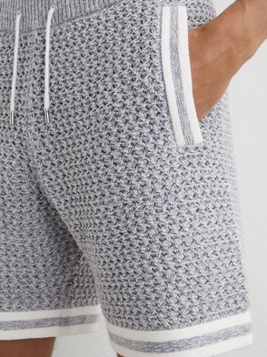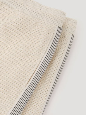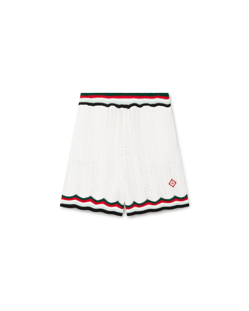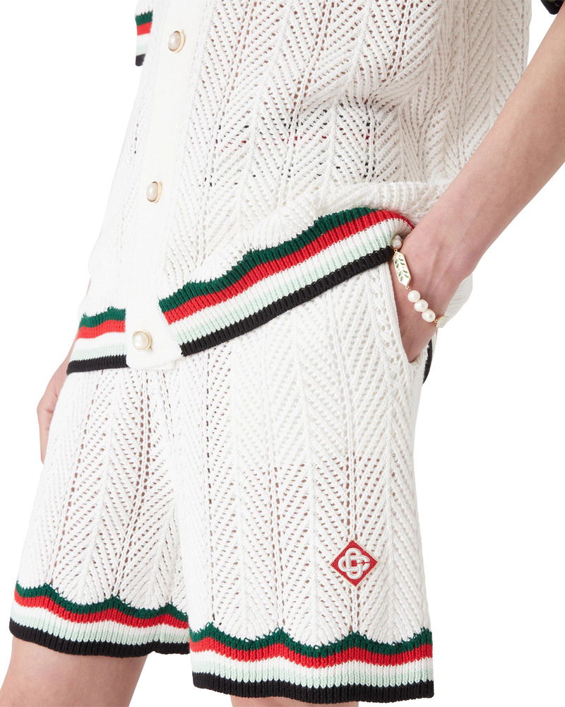 The chevron crochet shorts are a classic design crafted from a crochet cotton fabric featuring a chevron pattern and the house's signature diamond logo. Completed with an elasticated waistband, in-seam pockets, and striped hem and waistband detail. Crochet cotton fabric Main: 100% cotton Lining: 100% polyester Colour: white Specialised dry clean only Made in China The model is 187cm/6'1 and is wearing a size M Cotton Chevron Crochet Shorts, Size XS by Casablanca Paris
