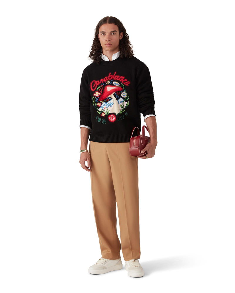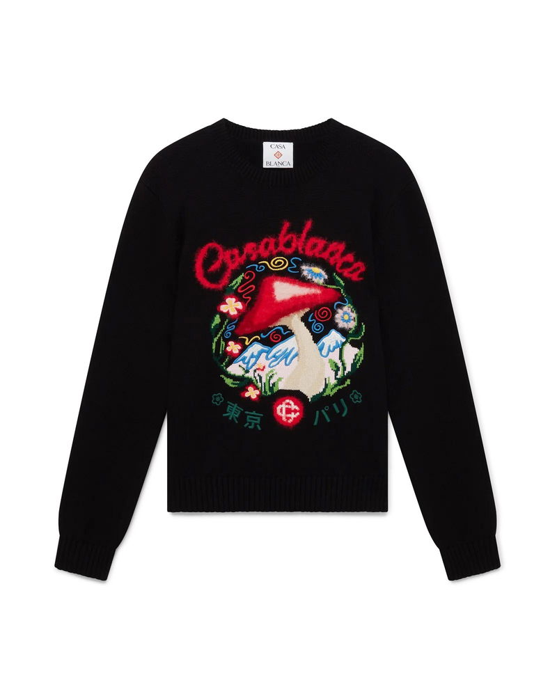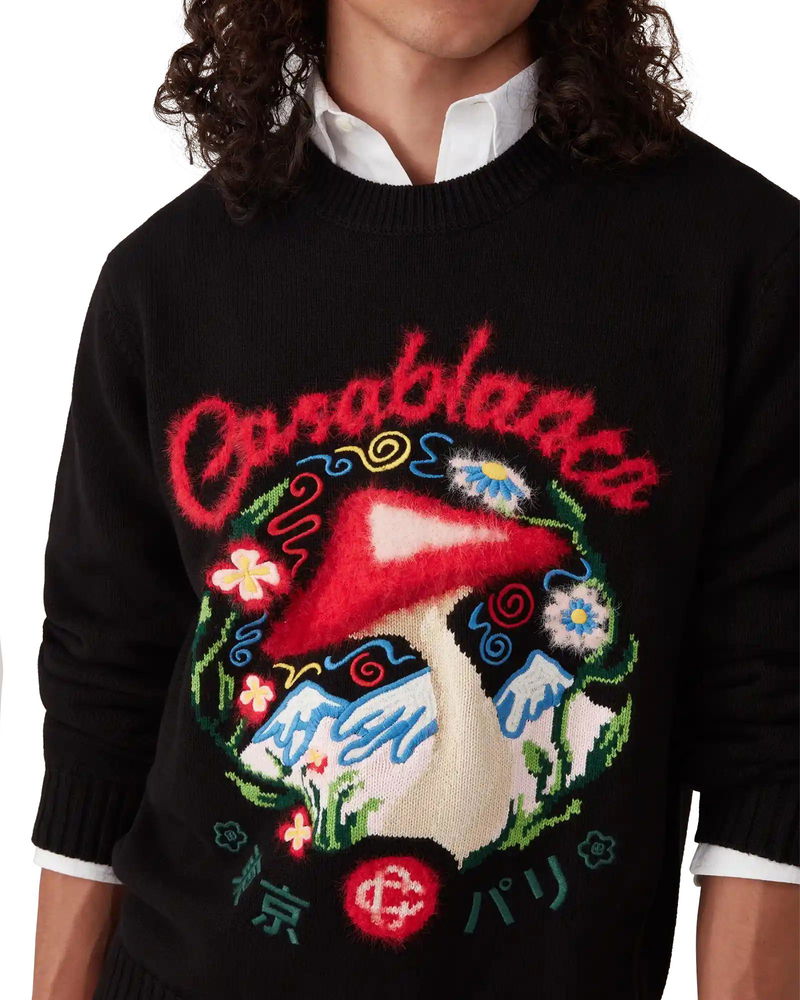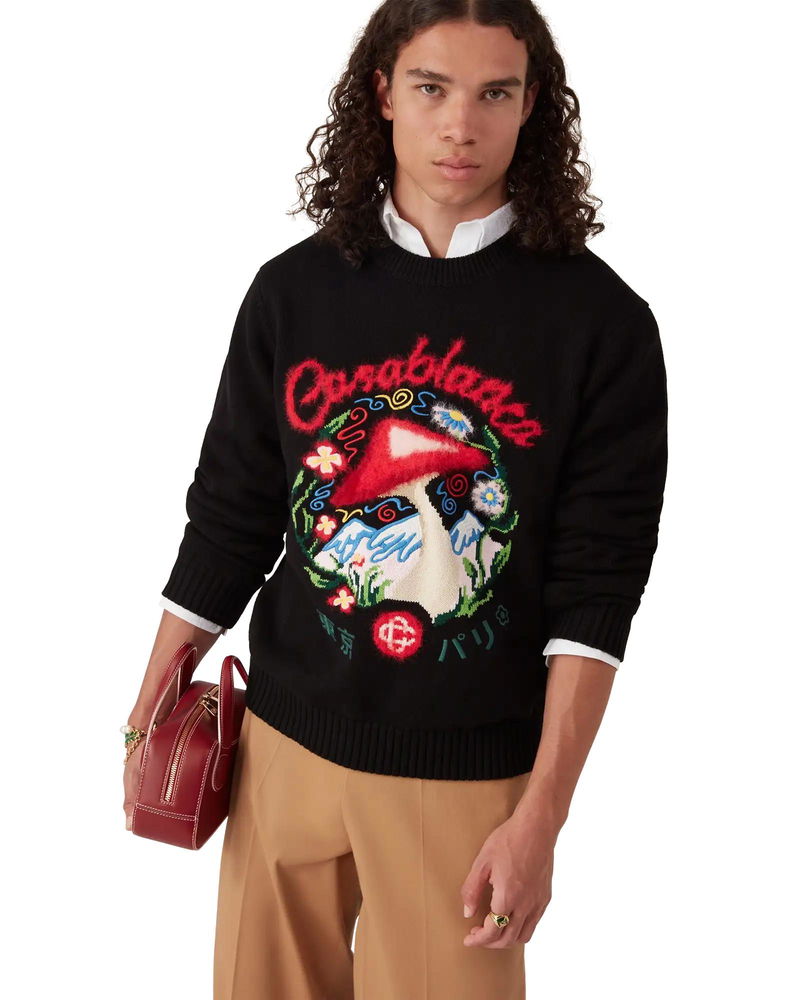 The cotton embroidered mushroom jumper is a long-sleeve design featuring one of the house's signature design elements - the mushroom - crafted from cotton fabric. Completed with a classic crew neck, ribbed cuffs and hem. Cotton fabric Main: 100% cotton Embroidery: 100% polyester Colour: black/multicoloured embroidery Specialised dry clean only Made in China Relaxed fit The model is 187cm/6'1 and is wearing a size M Cotton Embroidered Mushroom Jumper, Size XS by Casablanca Paris