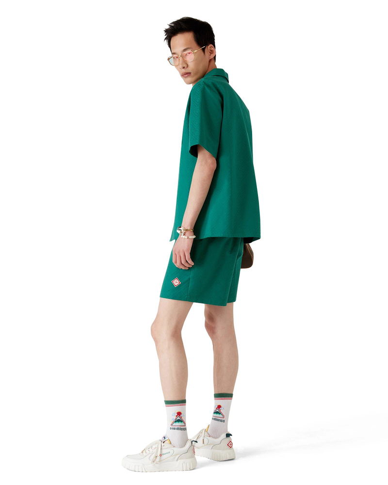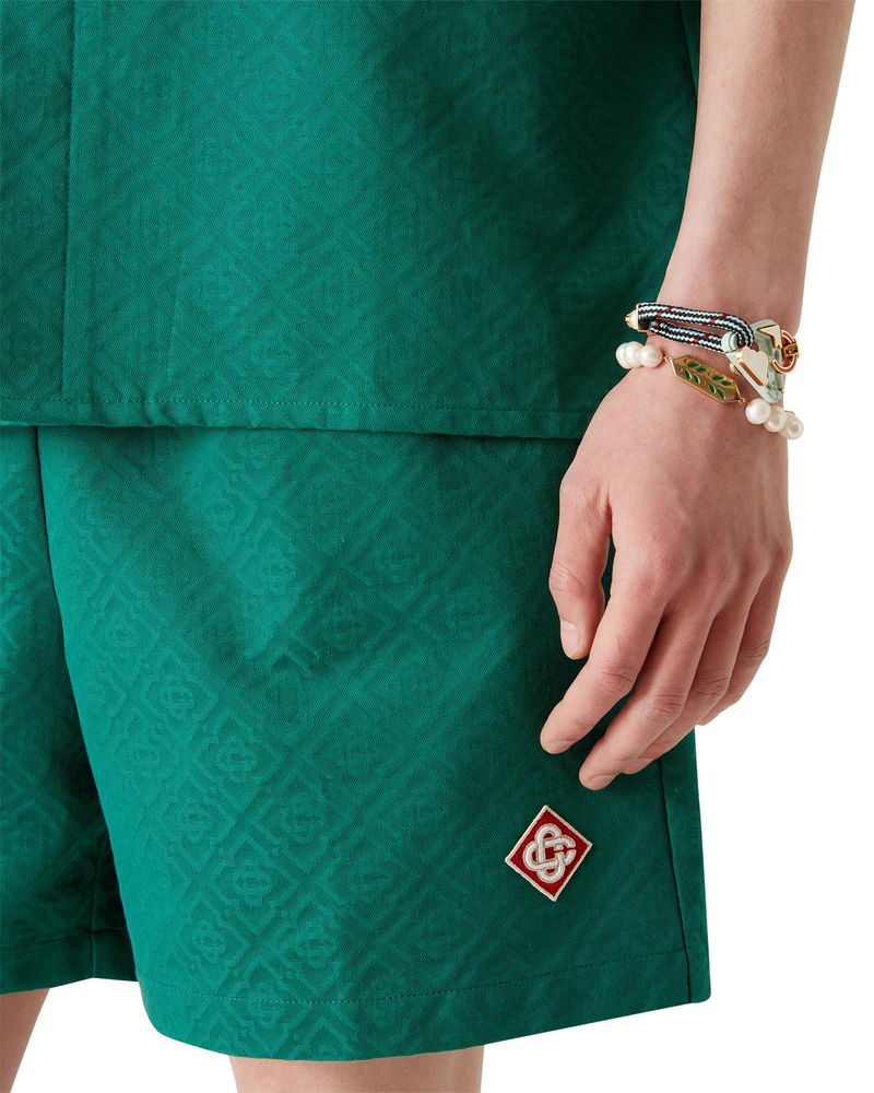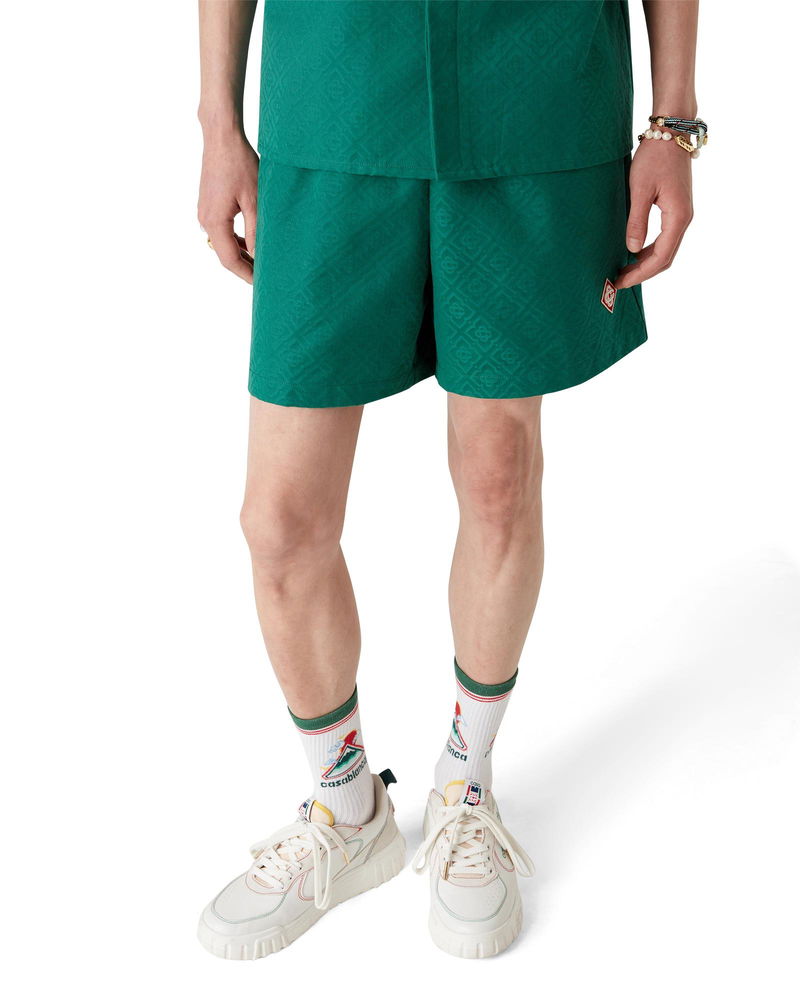 The cotton monogram jacquard shorts are a classic design crafted from a monogram cotton jacquard fabric. Completed with an elasticised waistband, gold-tipped drawstring fastening, a back pocket, and in-seam side pockets. Cotton jacquard fabric Main: 100% cotton Lining: 100% viscose Colour: green Specialised dry clean only Made in Italy Relaxed fit The model is 187cm/6'1 and is wearing a size M Cotton Monogram Jacquard Shorts, Size Medium by Casablanca Paris