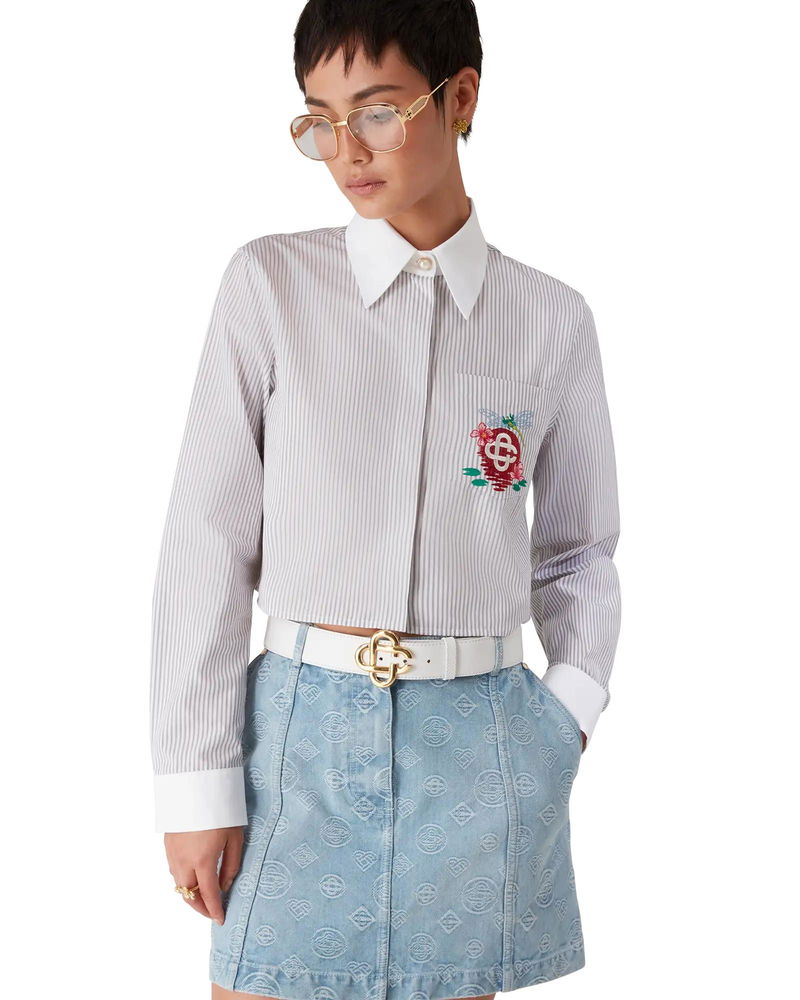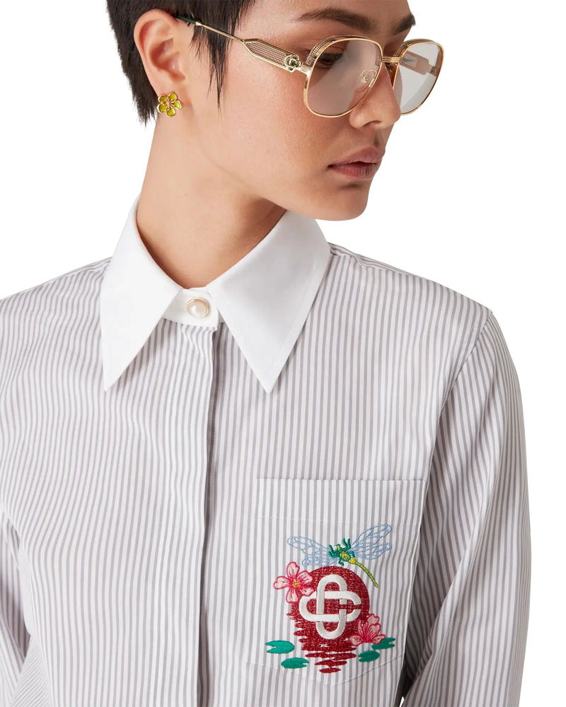 Completed with button closure, interlocking CC logo corozo buttons, signature gold rim pearl buttons at the collar and cuffs, a breast pocket featuring the season's dragonfly floral artwork, and contrast white point collar and cuffs.