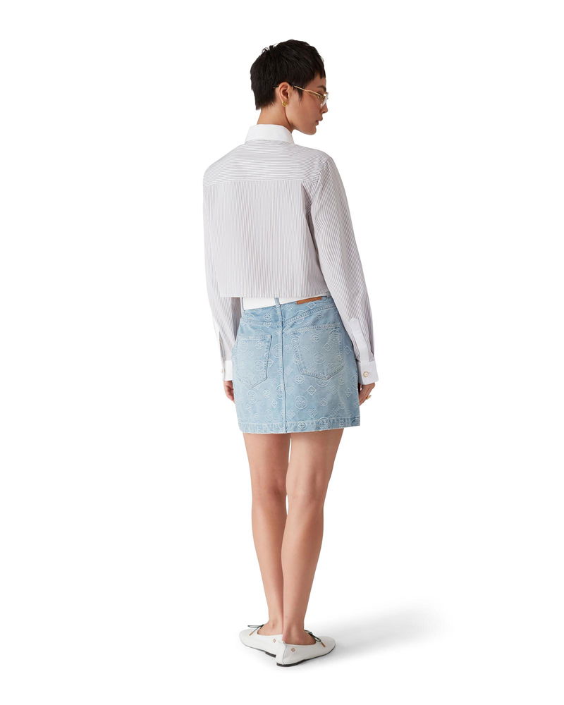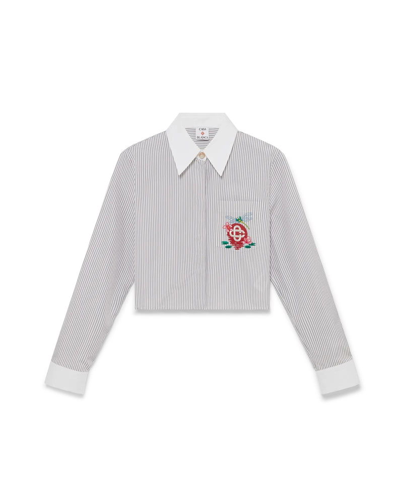 The stripe cropped long-sleeve shirt is a short style crafted from a cotton barré fabric.