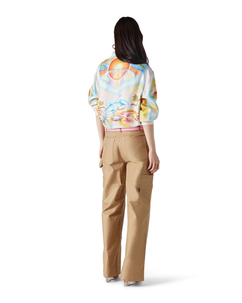 Completed with a waistband, belt loops, fabric patch details on the thighs, front pockets, a back patch pocket and gold-plated branded hardware.