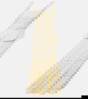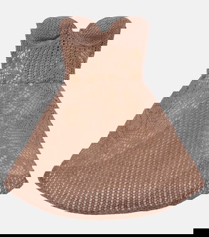 The crochet bustier dress is a mini-style crafted from an open-weave cotton blend fabric, with a fitted bralette and a deep open back.