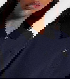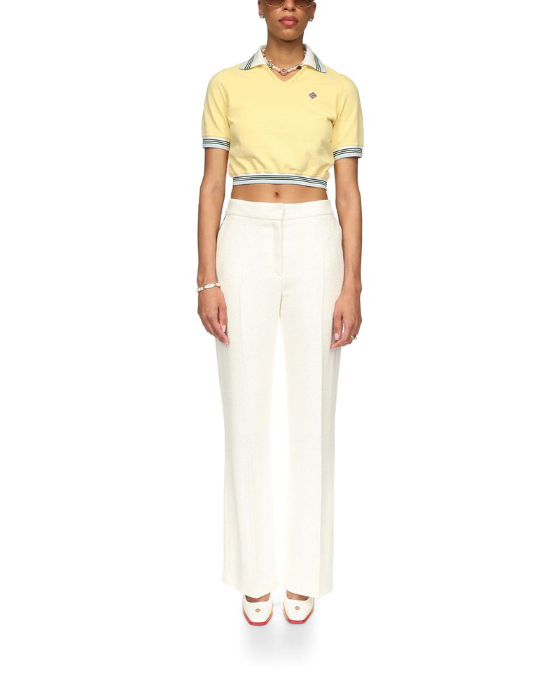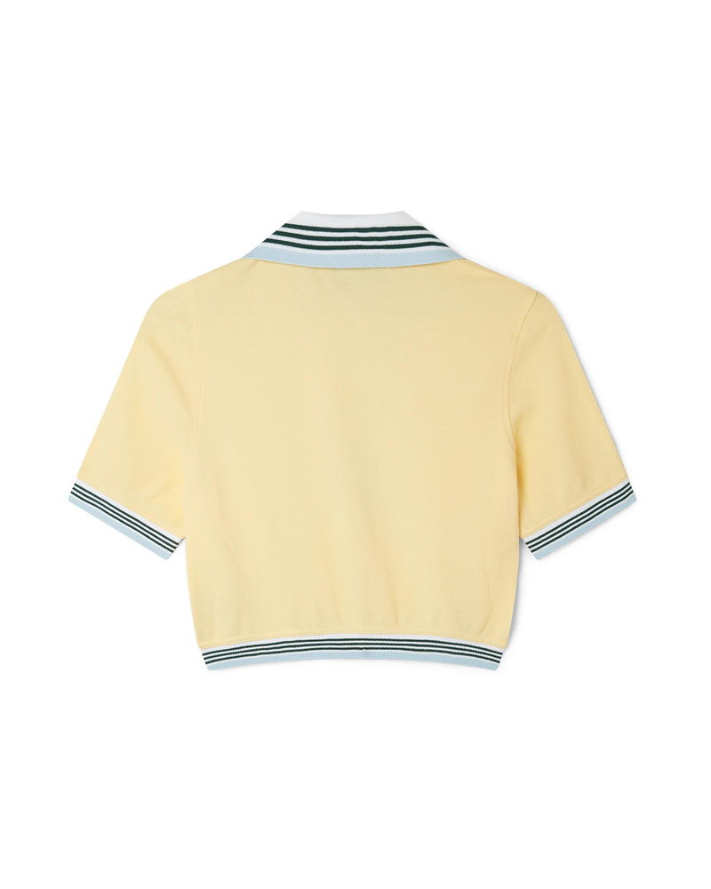 The cropped pique polo is a short-sleeve v-neck design with a slightly gathered hem.