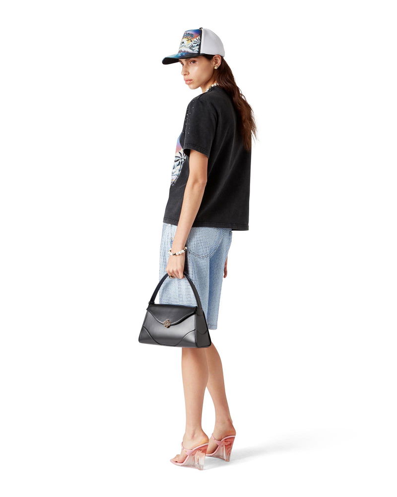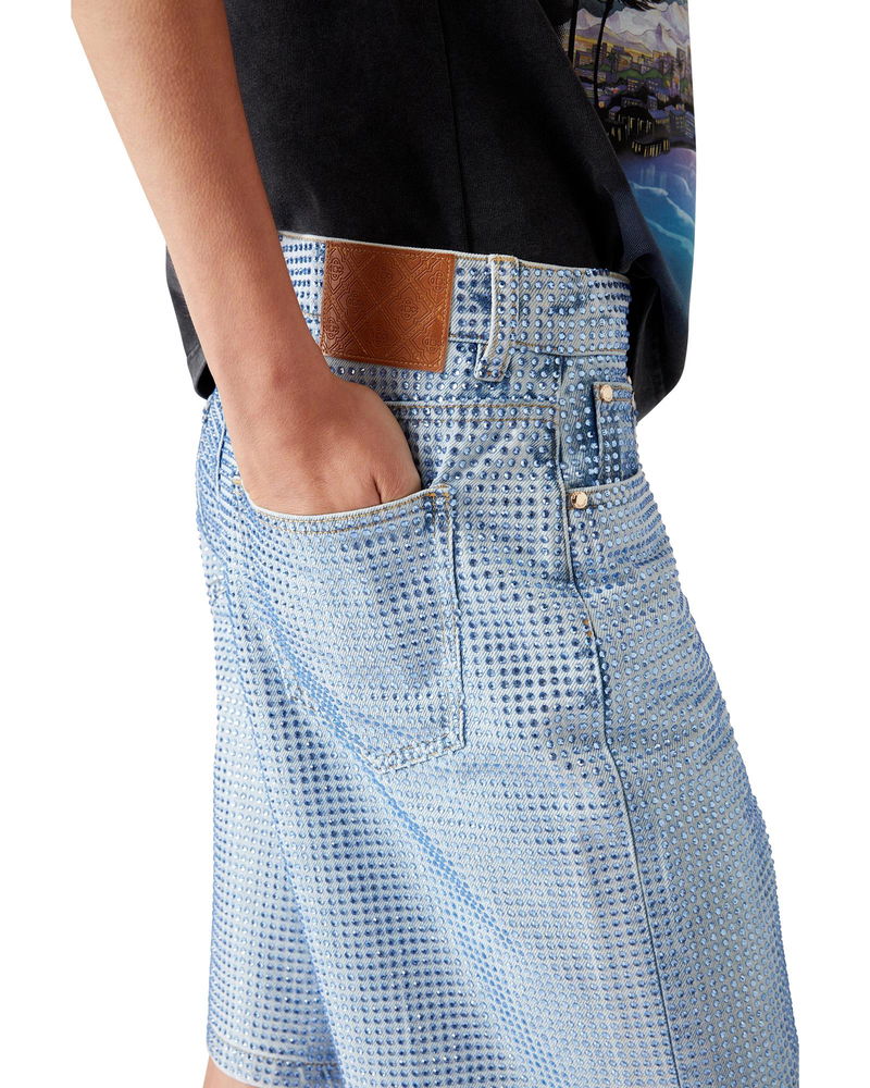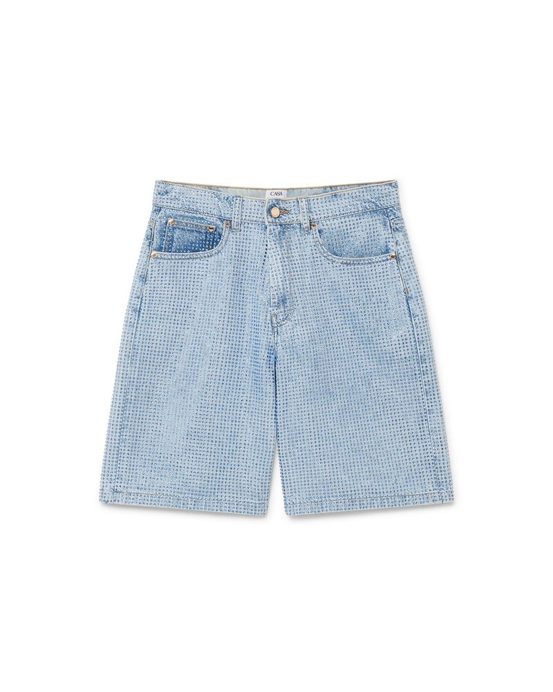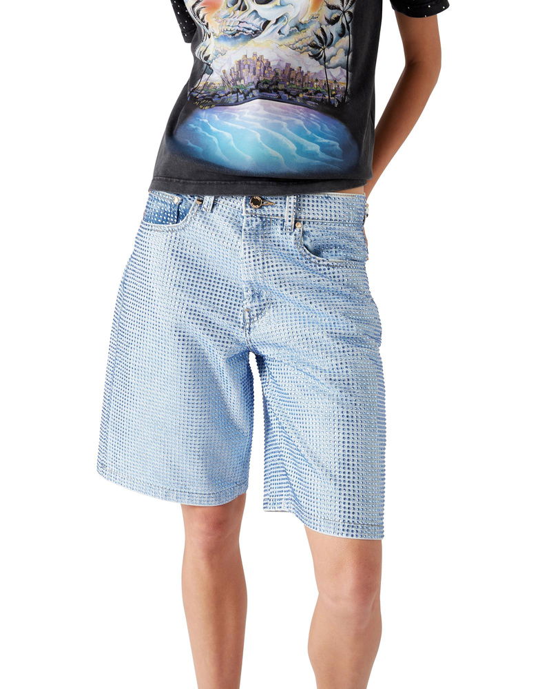 The crystal embellished denim shorts are a knee-length design with a relaxed silhouette crafted from denim fabric and glass beading.