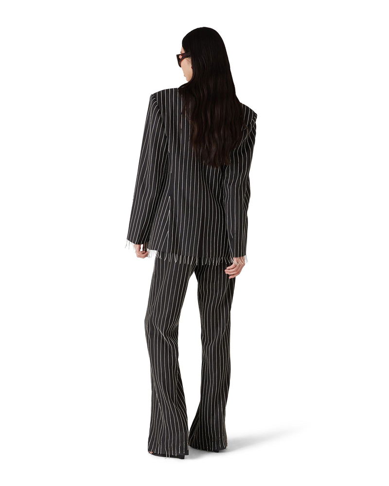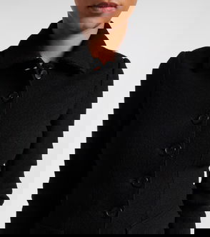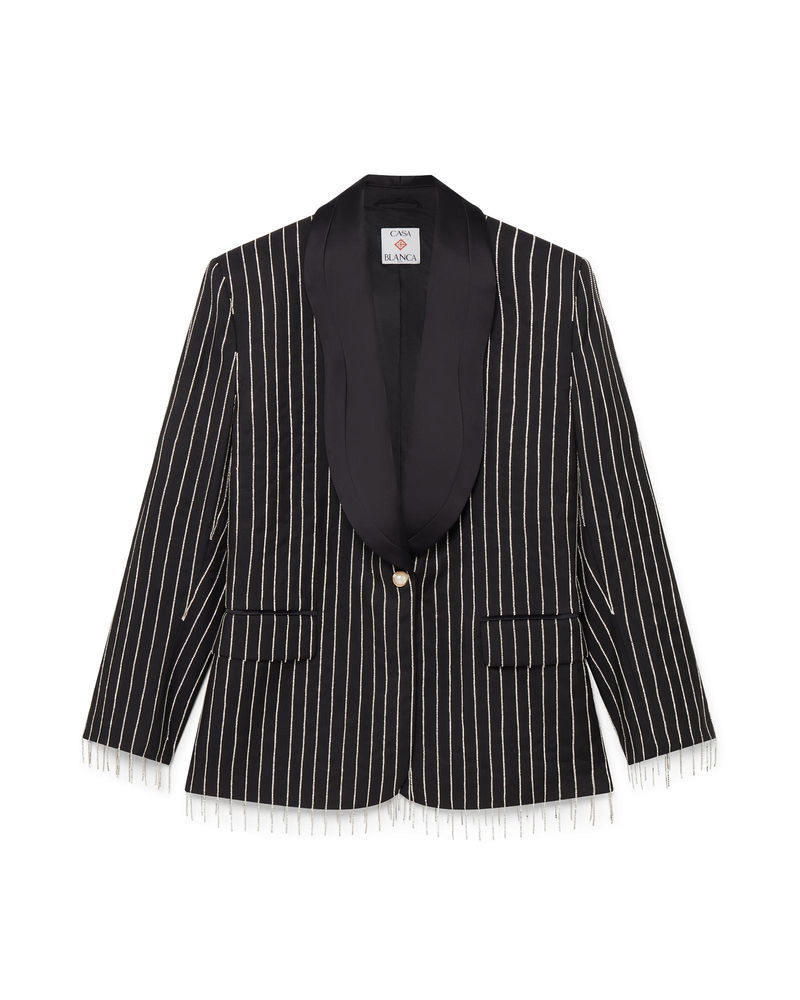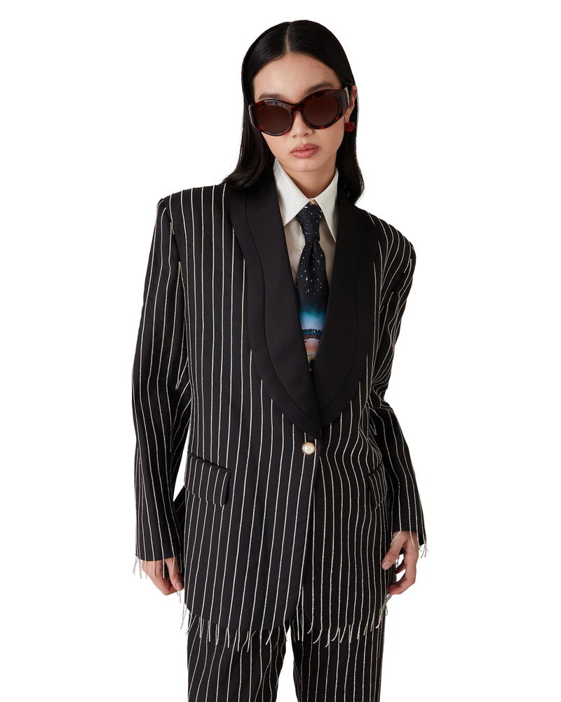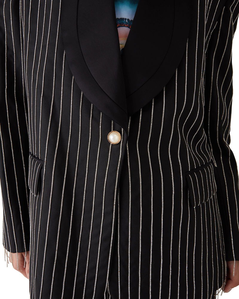 The crystal embellished tailored jacket is a single-breasted design crafted from silk tailoring fabric and crystals.