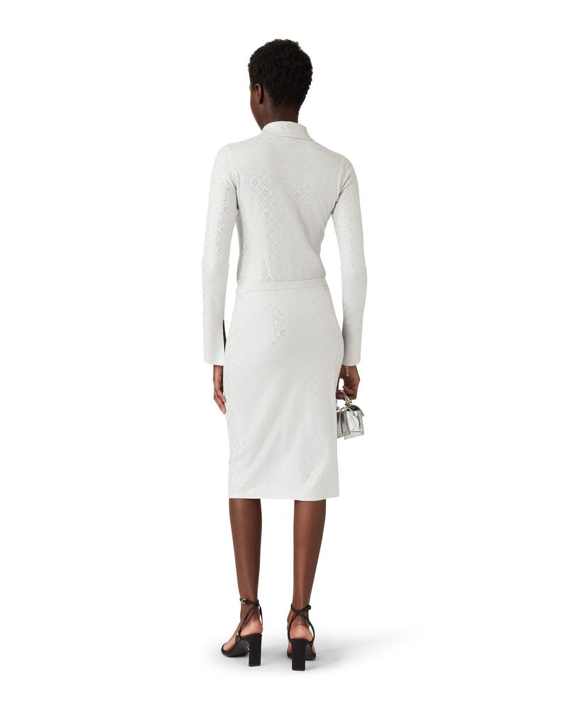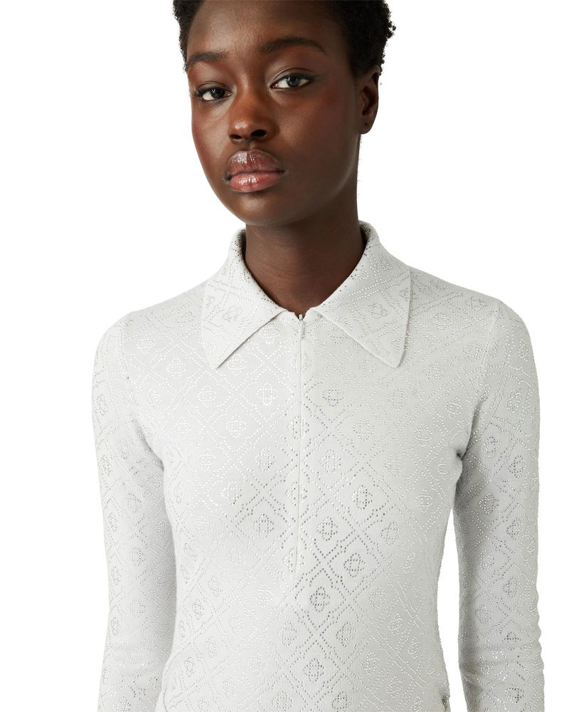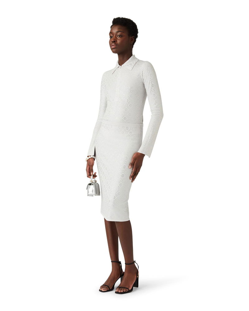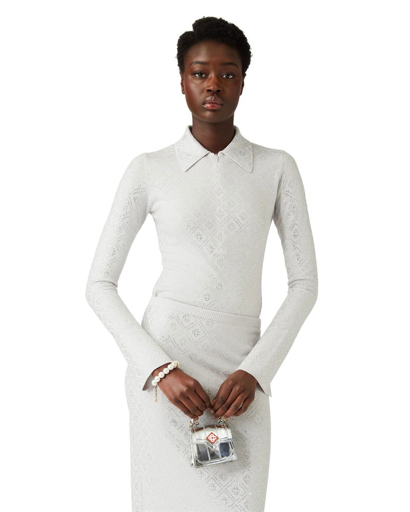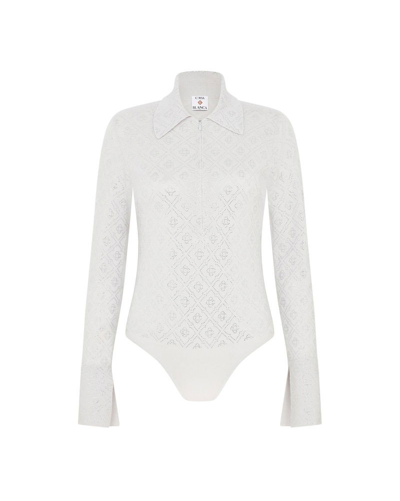 The crystal monogram knit bodysuit is a one-piece form-fitting long-sleeve design crafted from merino wool fabric and features the house's crystal monogram.