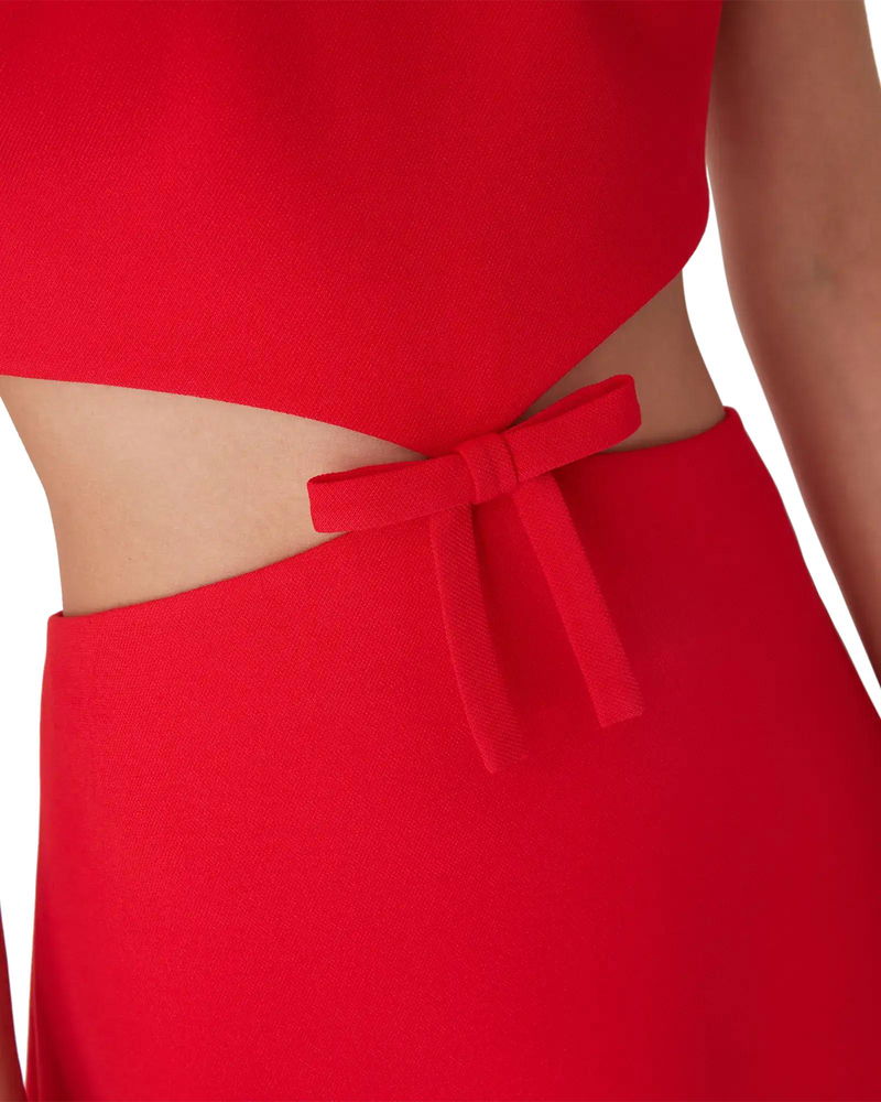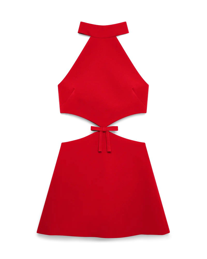 The cut-out dress is a sleeveless, A-line mini design featuring cut-out sides. Completed with zip closure, a halter neck with a band collar, and bow detail at the waist where the fabric tapers.