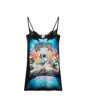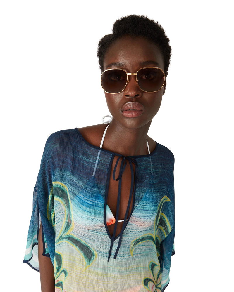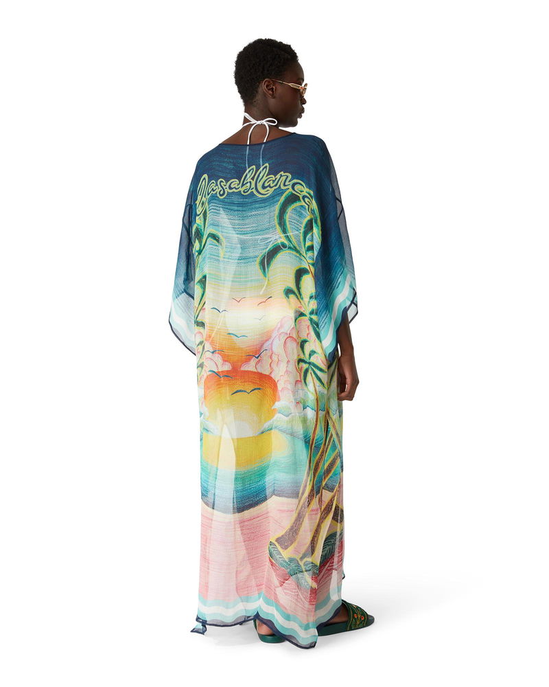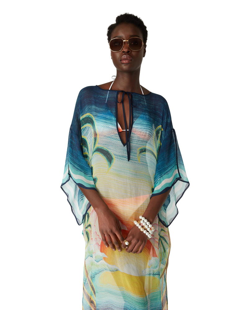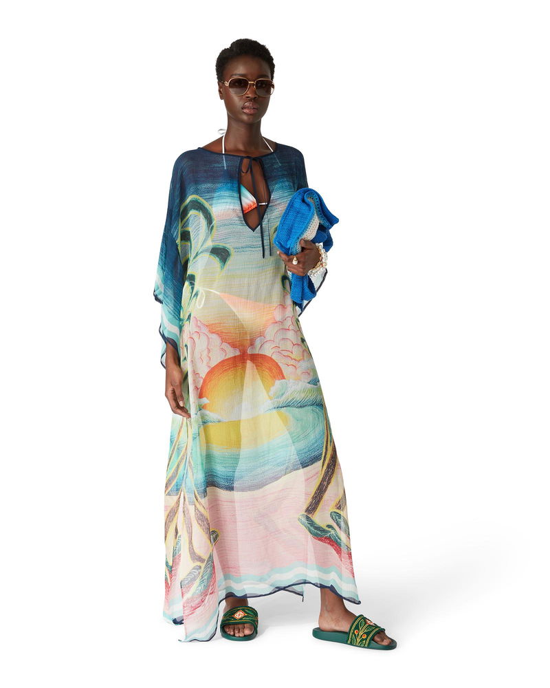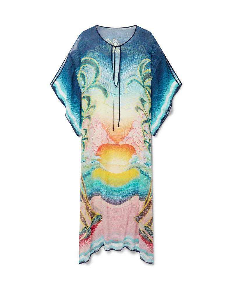 The Danse De La Mer kaftan is a loose-fit lightweight design crafted from printed silk fabric featuring hand-painted scenes created especially for the collection. Completed with wide sleeves, side slits, a v-neck with string closure. Printed silk fabric.