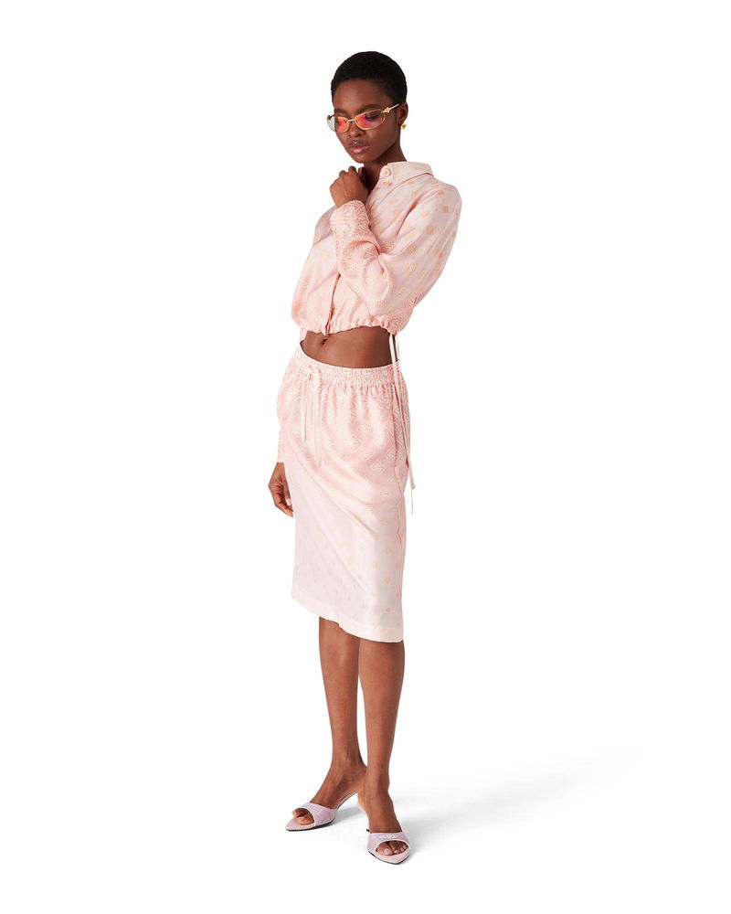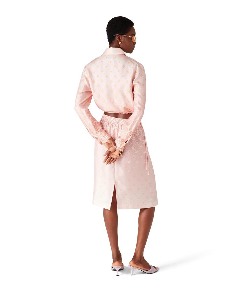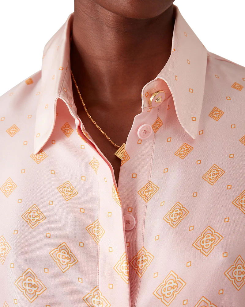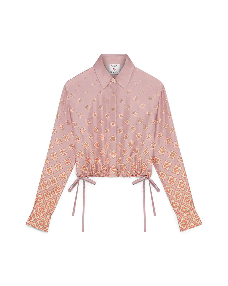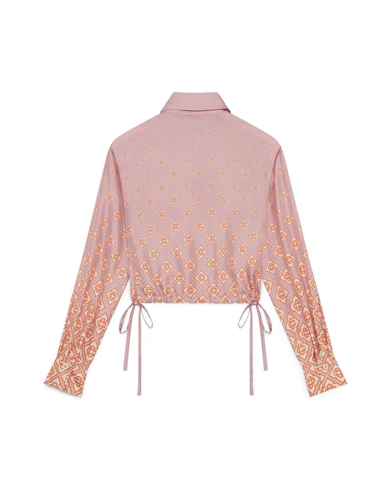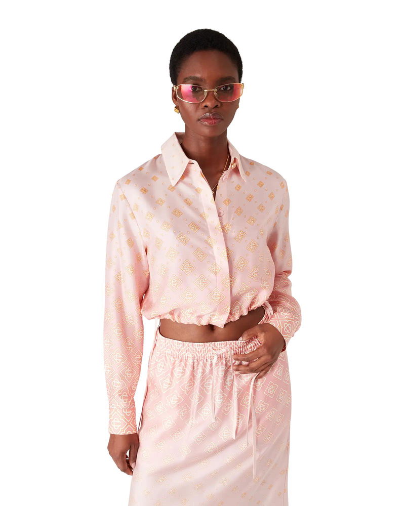 The Degrade Monogram long-sleeve silk shirt is a cropped design crafted from silk twill, featuring the house's monogram rendered in gradient tones. Completed with a point collar, button closure, interlocking CC logo corozo buttons, signature gold rim pearl buttons on the cuffs and collar, string fastenings at the sides, and a cropped silhouette.