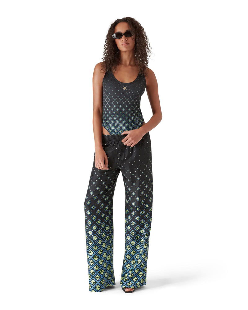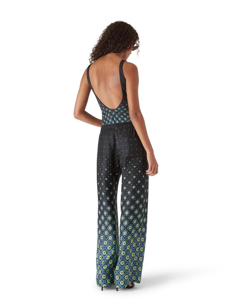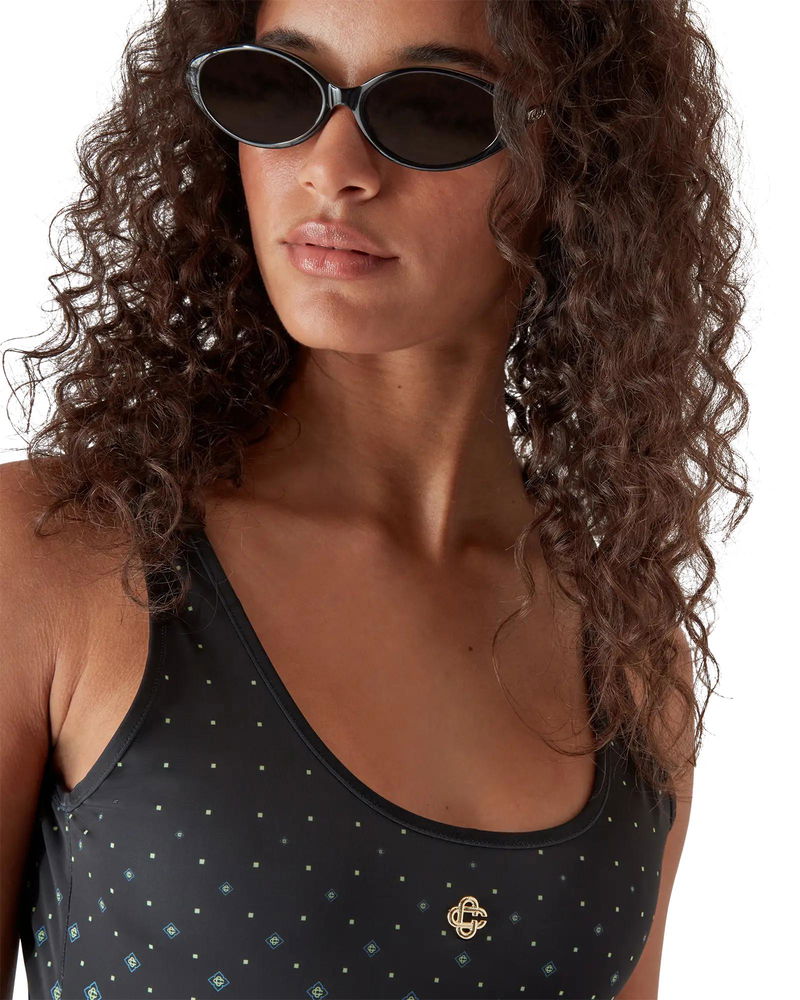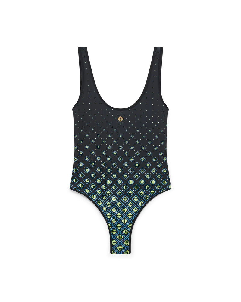The Degrade black monogram printed swimsuit is a refined design featuring the house's signature black monogram pattern. Completed with the house's signature diamond logo on the chest, high-cut legs, a scoop neck, a deep scoop back, and edge detail.
