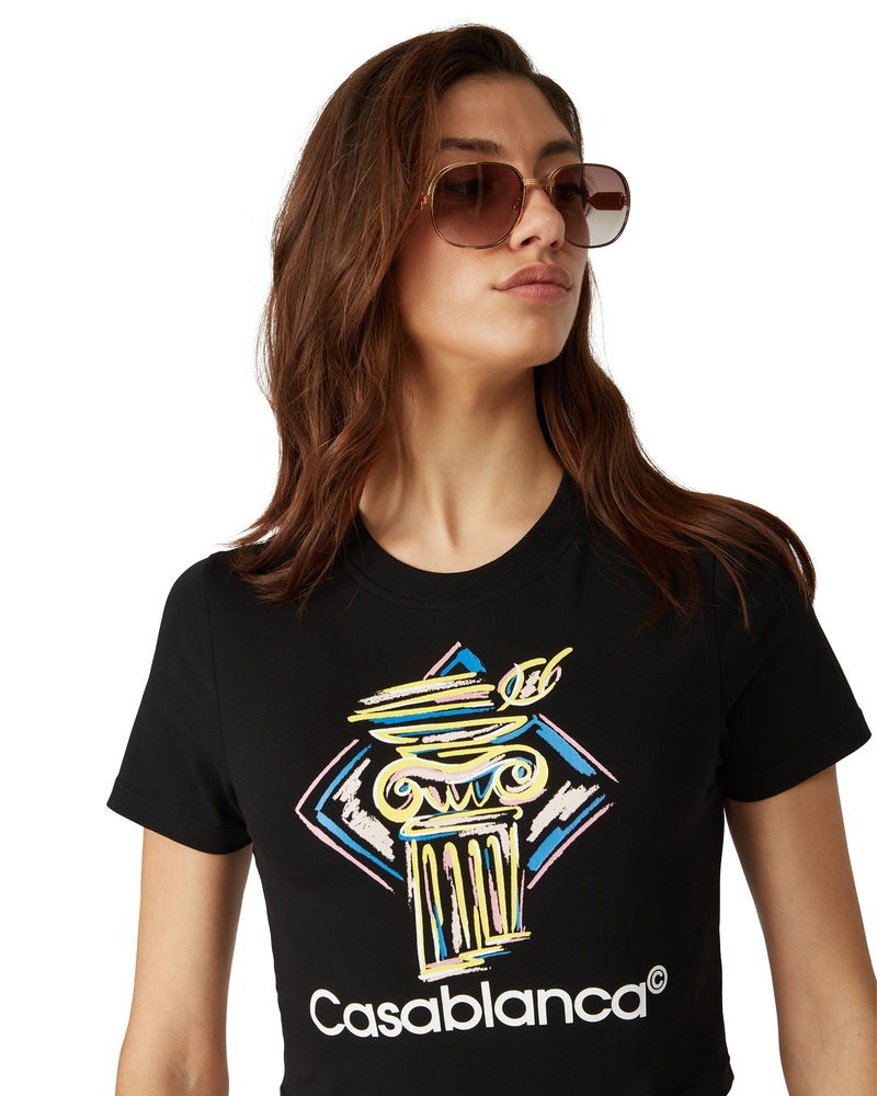 The Diamond Column baby t-shirt is a cropped short-sleeved printed design crafted from cotton blend fabric featuring the house's crayon iconography of a column. Completed with a classic crew neck - designed to fit above the navel.