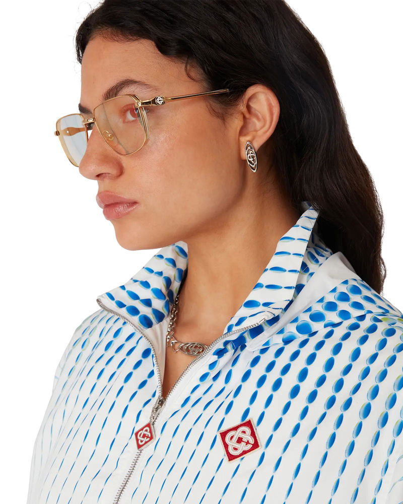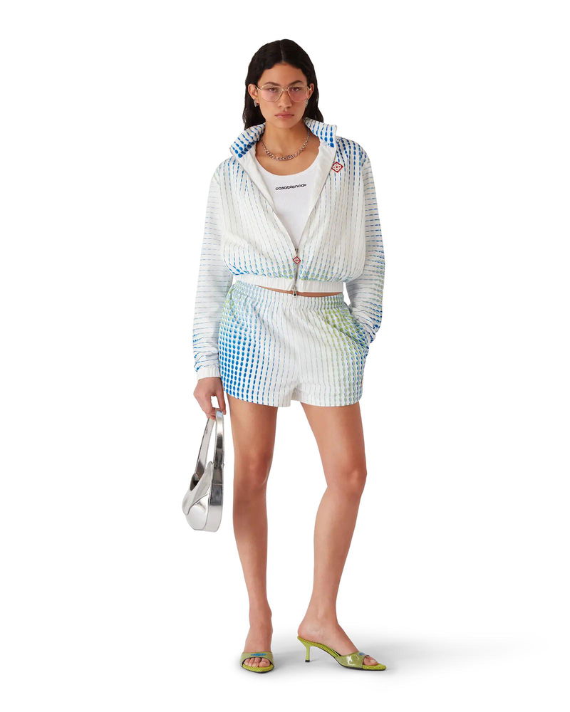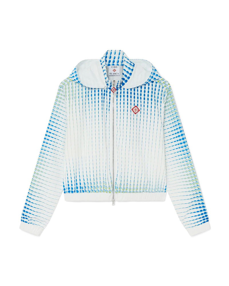 The Dots windbreaker jacket is a sportswear design crafted from a technical taffeta fabric with the house's signature artistry, featuring gradient motifs and texture effects. Completed with a long sleeve, a hood with drawstring fastening, elasticised cuffs and hem, a zip closure featuring the house's signature diamond zipper tab, and the house's diamond logo.