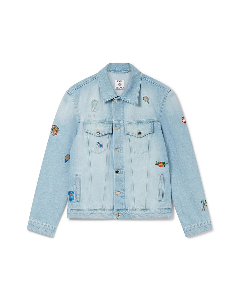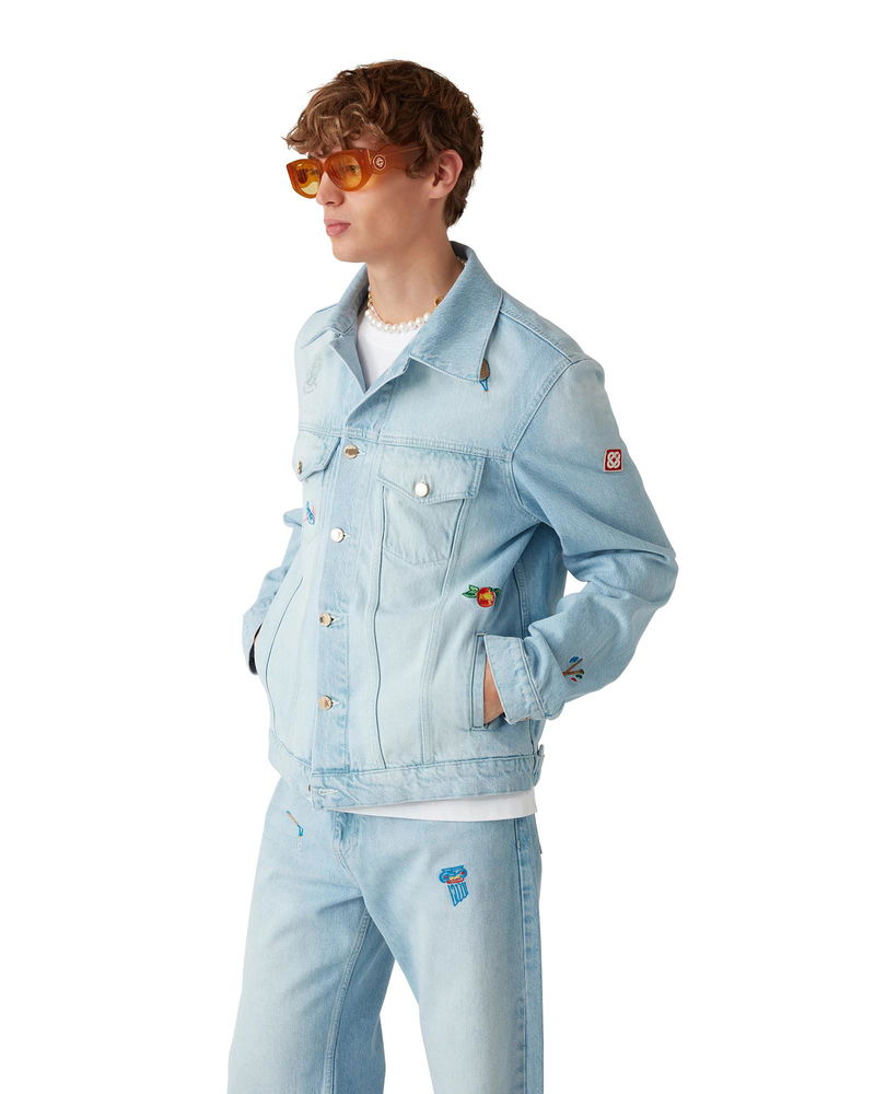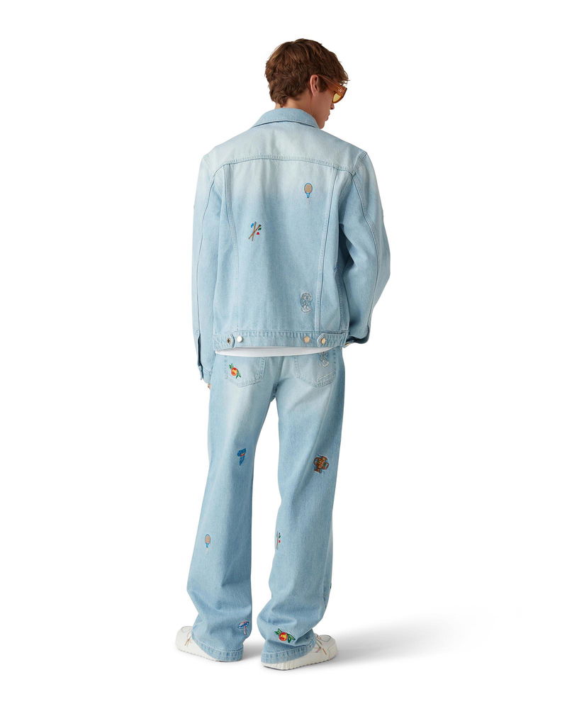 The embroidered motif denim jacket is a classic silhouette crafted from embroidered cotton fabric designed for a classic fit. Finished with embroidered artwork representing the house's symbology with nature and architecture, chest pockets and gold-plated snap button closure. Intended to be worn with its coordinating straight-leg jeans. Embroidered cotton fabric Main: 100% cotton Embroidery: 100% polyester Colour: light vintage wash Specialised dry clean only Made in Turkey Fits true to size, take your regular size The model is 185cm/6'1and is wearing a size M Embroidered Motif Denim Jacket, Size Medium by Casablanca Paris