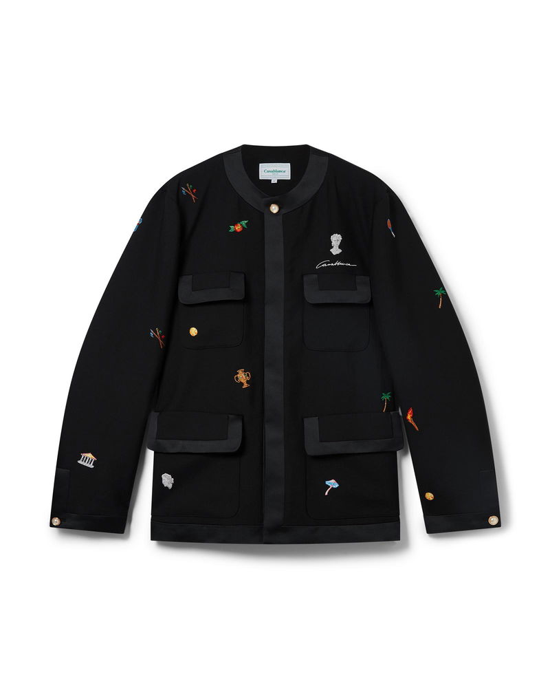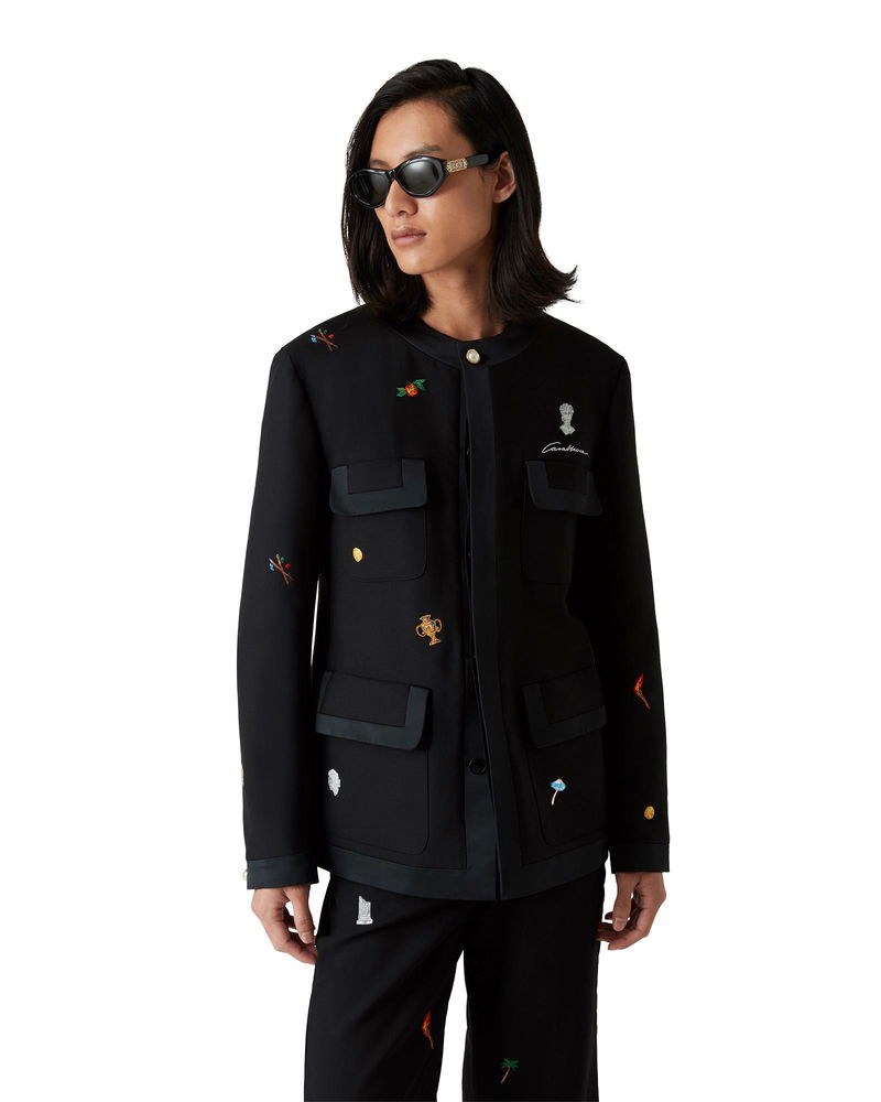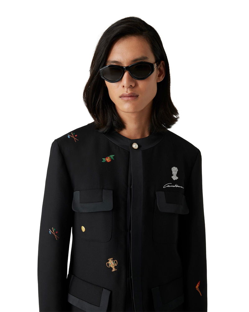 The embroidered motif wool tailored jacket is a classic silhouette crafted from embroidered wool fabric. Finished with embroidered artwork representing the house's symbology with nature and architecture, chest pockets, a lining, and gold-plated snap button closure. Intended to be worn with its coordinating straight-leg jeans. Virgin wool fabric Main: 100% virgin wool Lining: 52% viscose 48% cotton Colour: black motif icons Specialised dry clean only Made in Portugal Fits true to size, take your regular size The model is 186cm/6'1 and is wearing a size M Embroidered Motif Wool Tailored Jacket in Black, Size 46 by Casablanca Paris