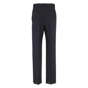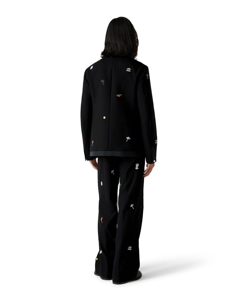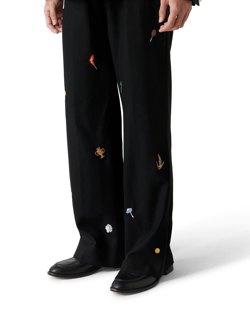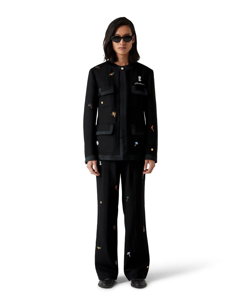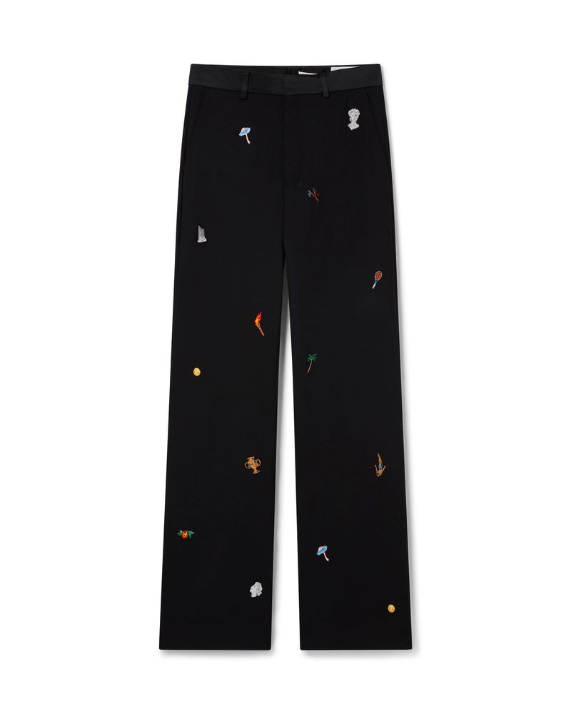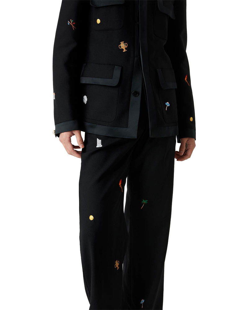 The embroidered motif wool tailored trousers are a classic silhouette crafted from embroidered wool fabric. Finished with embroidered artwork representing the house's symbology with nature and architecture, slanted side pockets, a lining, zip closure, belt loops, and back pockets. Intended to be worn with its coordinating jacket. Virgin wool fabric Main: 100% virgin wool Lining: 52% viscose 48% cotton Contrast: 100% polyester Embroidery: 100% polyester Colour: black Specialised dry clean only Made in Portugal Fits true to size, take your regular size Model is 186cm/6'1 and is wearing a size M Embroidered Motif Wool Tailored Trousers, Size 48 by Casablanca Paris
