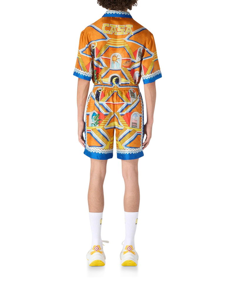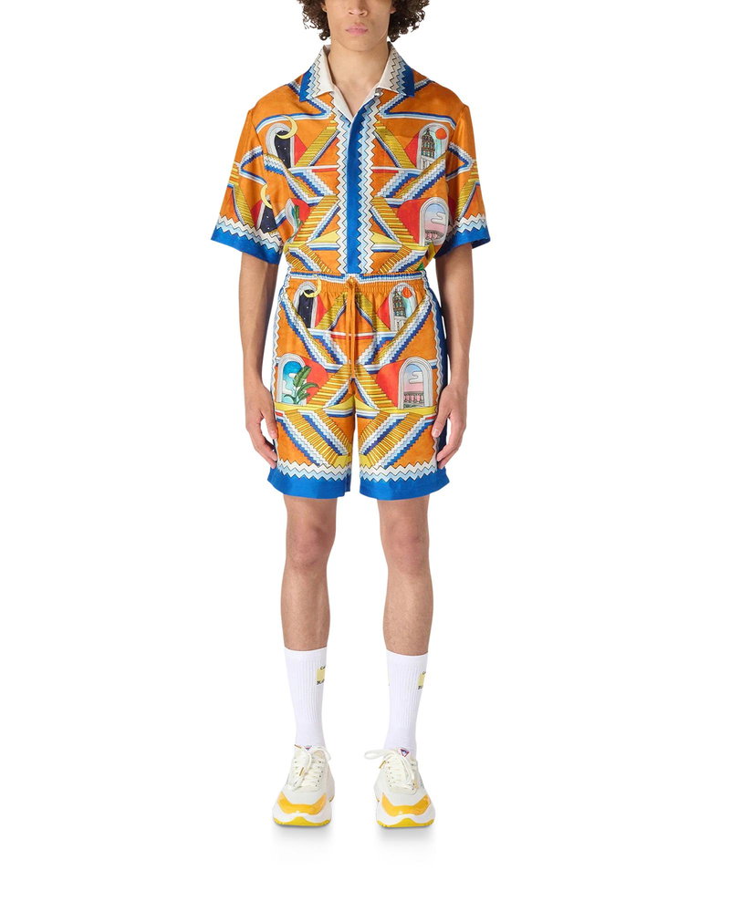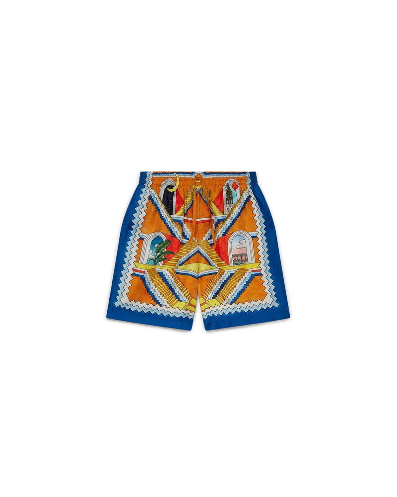 Men's Escalier Infini silk shorts feature the radiant never-ending staircase artwork of this season. Finished with a contrasting blue and white zig-zag trim, and draw-string waistband. Printed silk satin fabric 100% silk Escalier Infini print multicolour Specialised dry clean only. Made in Italy Fits true to size, take your regular size The model is 187cm/6'1 and is wearing a size M Escalier Infini Silk Shorts in Blue, Size XS by Casablanca Paris