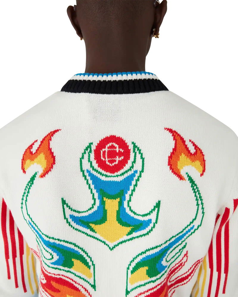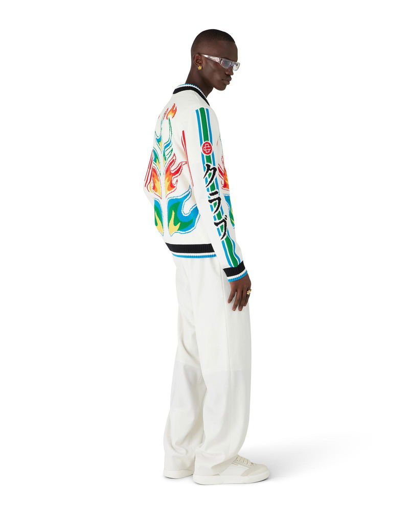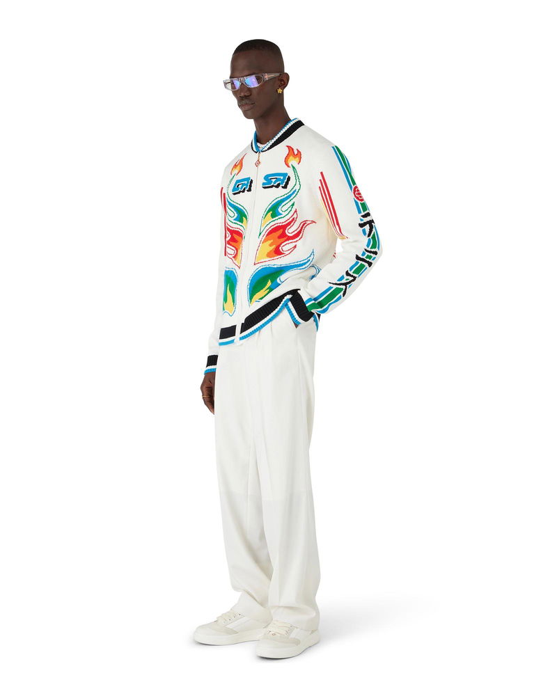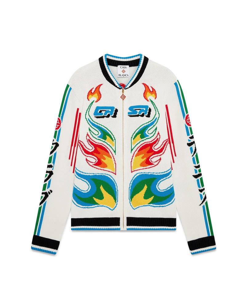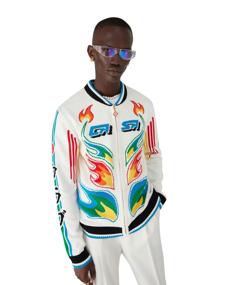 The Flame Laurel cotton knit Casa Club jacket is a long-sleeve design featuring the season's Flames artwork, an updated version of the Laurel artwork - featured in our Spring-Summer '24 Nigerian collection - playing with the strong graphics found in vintage Japanese football kits. Completed with a zip closure featuring the house's signature diamond logo zipper tab, interlocking CC logo, a blue, white and green stripe detail down the sleeves, and a black, white and blue rib cuffs, hem and baseball-style collar details.