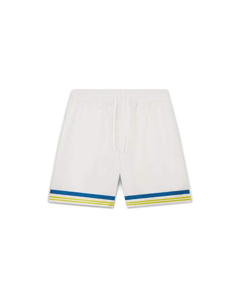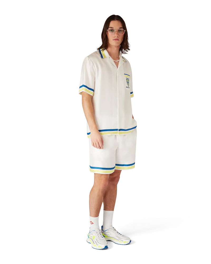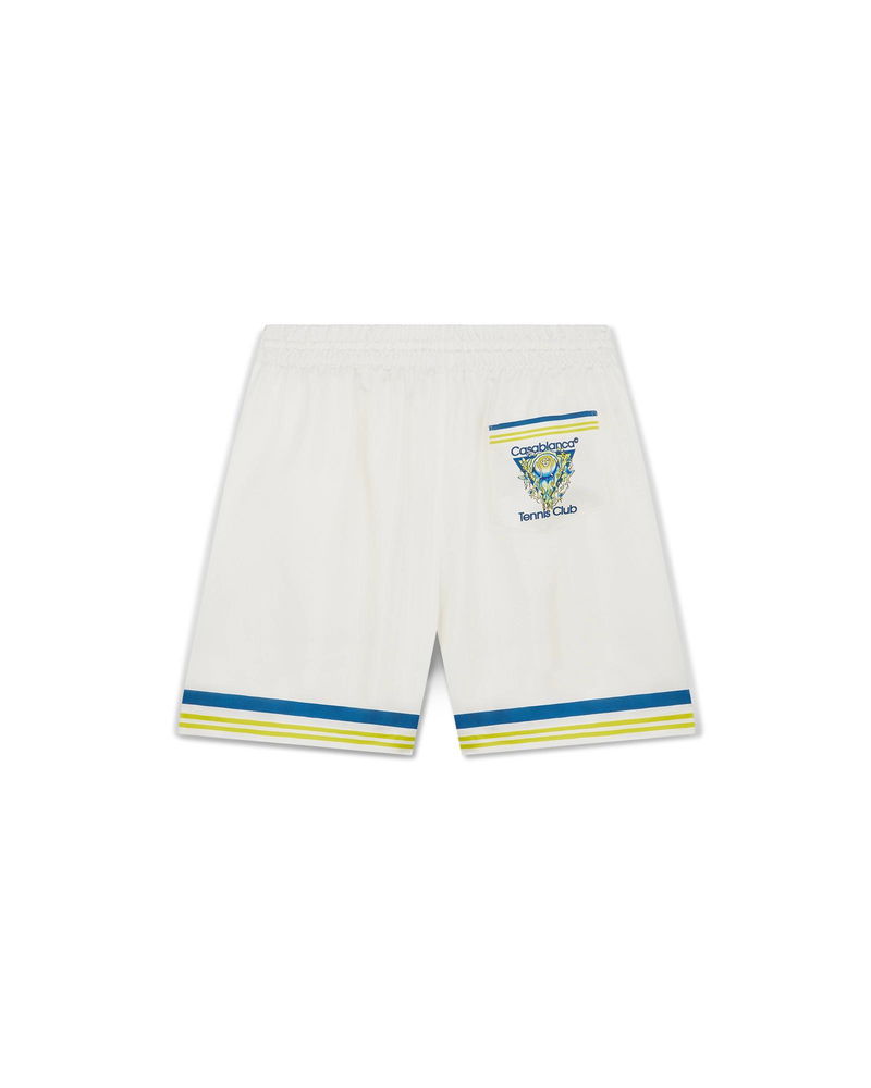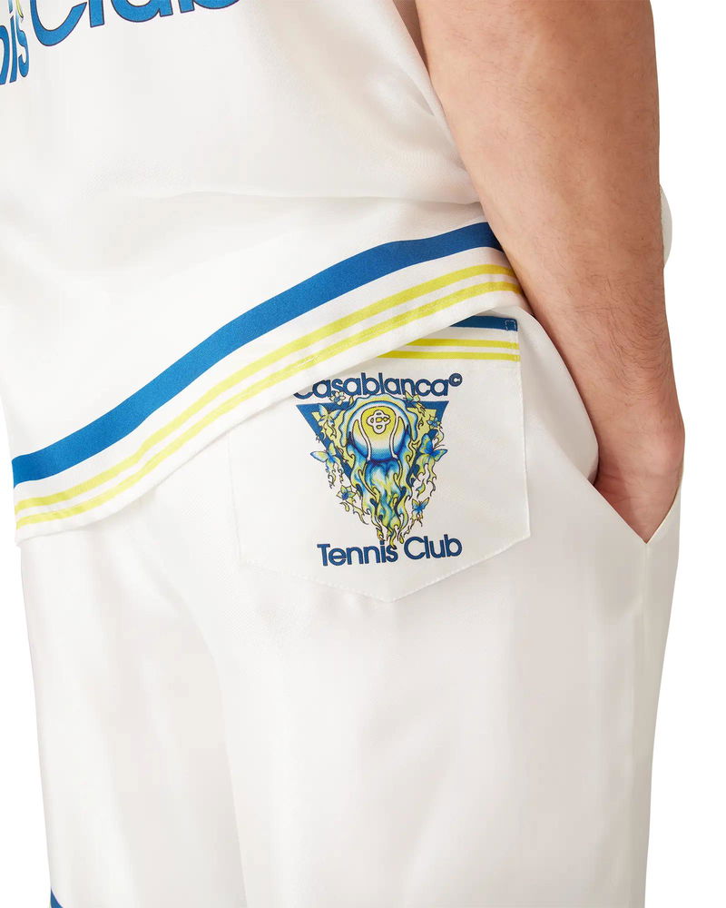 The Flaming Tennis Club Icon silk shorts are a printed design, featuring artwork of the house's distinctive tennis ball motif in flight, reflecting the fundamental balance of power, speed and control. Completed with an elasticised waistband, drawstring fastening, in-seam side pockets, and a back patch pocket. Silk twill fabric 100% silk Flaming Tennis Club Icon Specialised dry clean only Made in Italy Relaxed fit The model is 186cm/6'1 and is wearing a size M Exclusive to casablancaparis. com Flaming Tennis Club Icon Silk Shorts, Size XS by Casablanca Paris