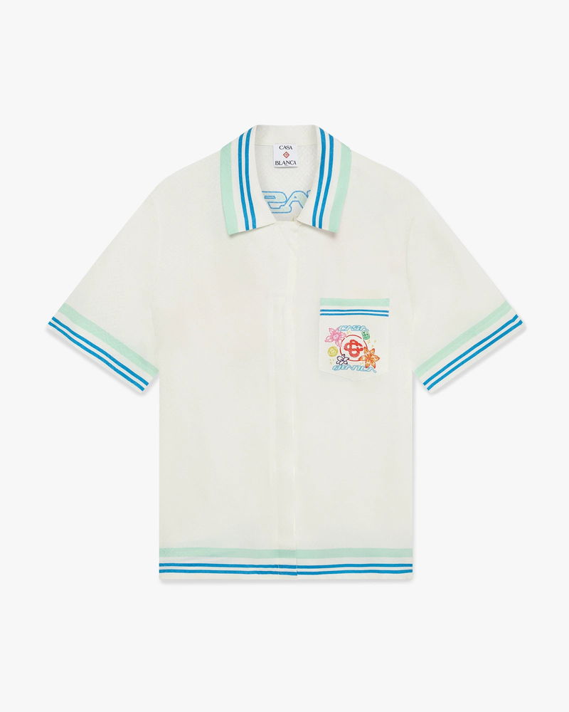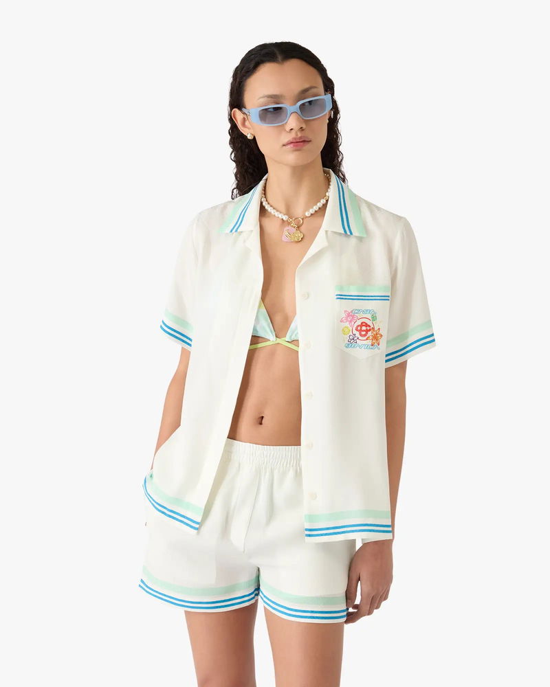 Completed with a Cuban collar, button closure, interlocking CC logo corozo buttons, a breast pocket, and green, blue and white stripe edge detail on the collar, cuffs, hem and pocket, in a relaxed silhouette.