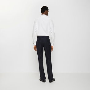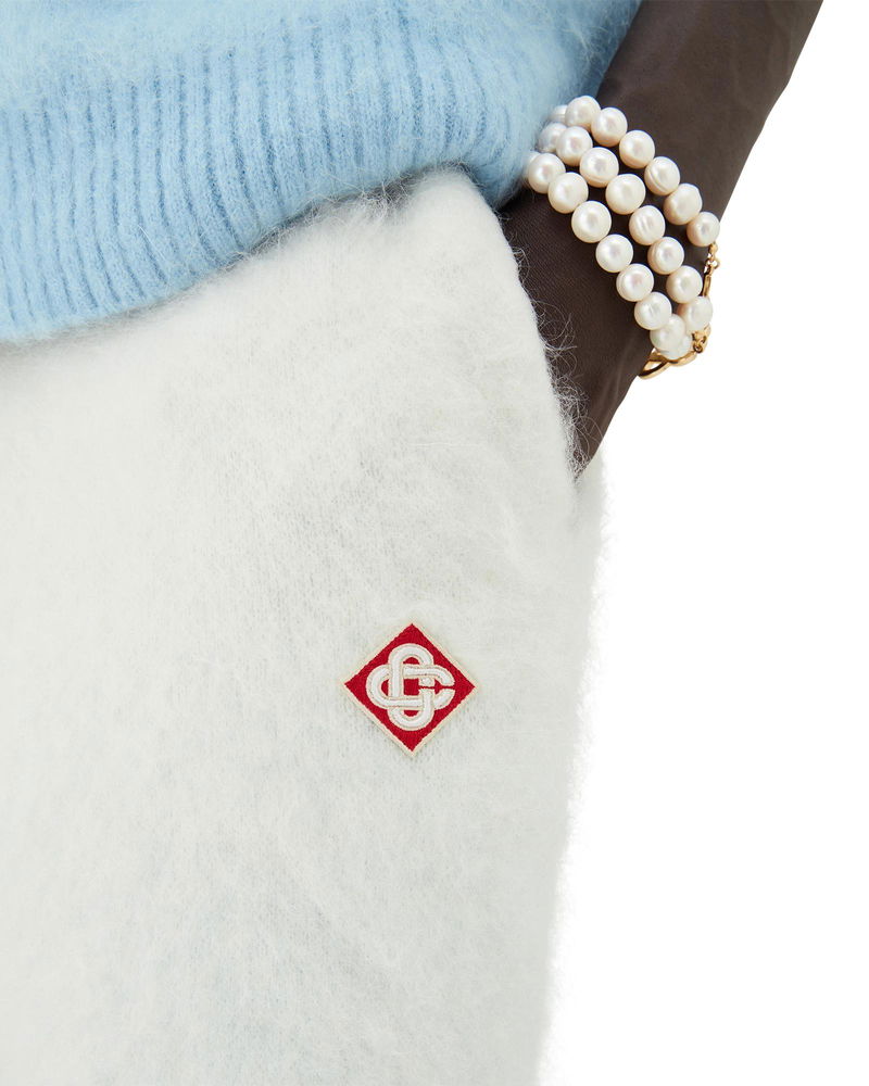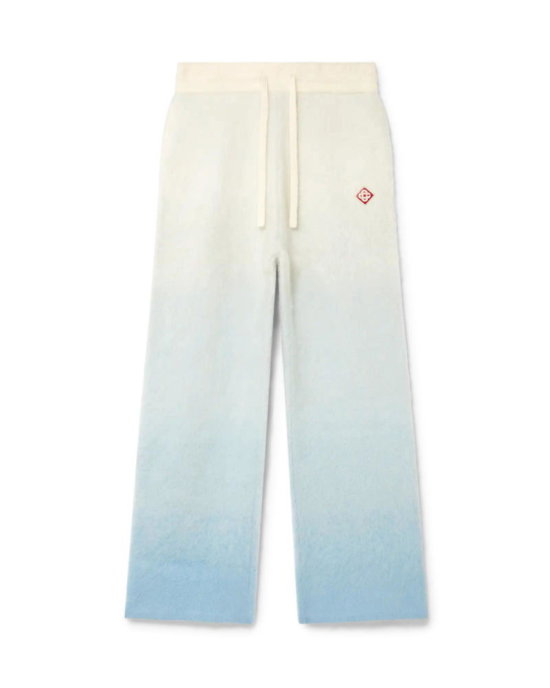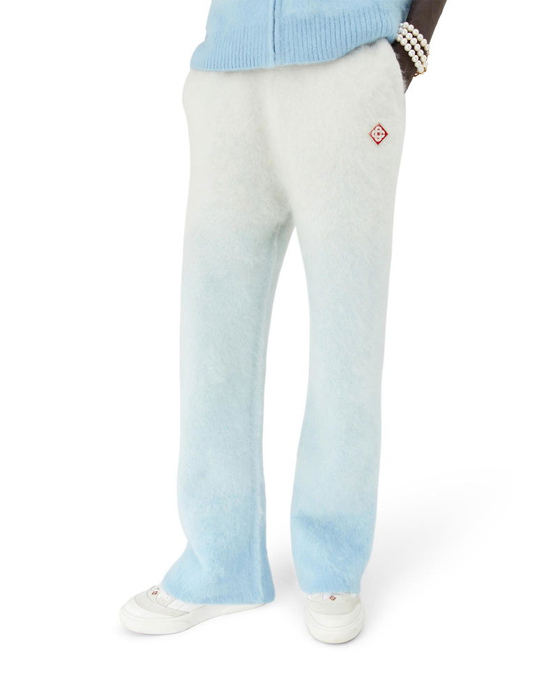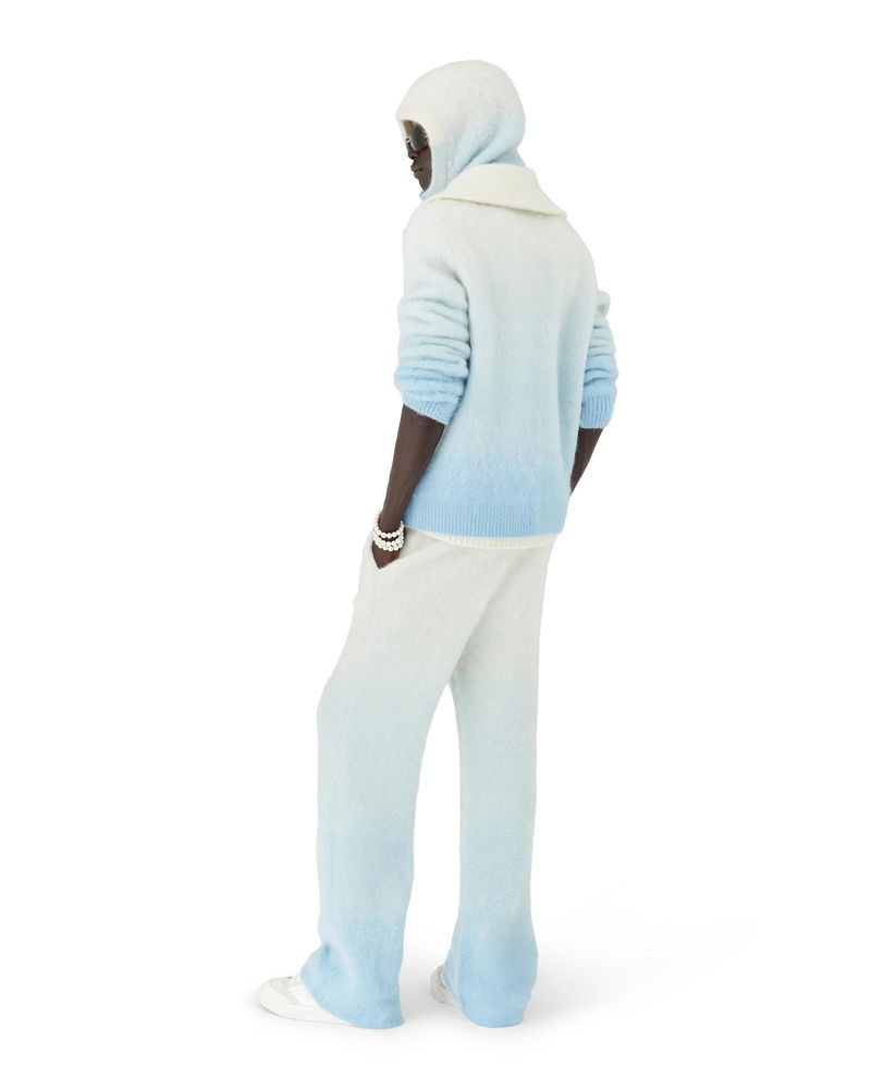 The ski monogram trousers is a refined après-sport design crafted from mohair mix fabric, featuring a blue and white gradient inspired by morning mist rising over Japan's alpine countryside. Drawing from dawn breaking across snow-laden rice terraces and soft colour transitions where frozen lakes meet distant mountain ranges. Mohair mix fabric.