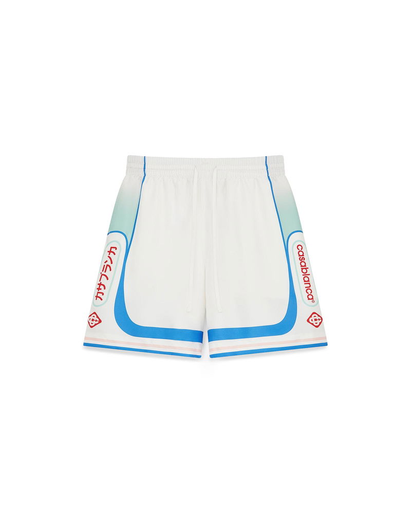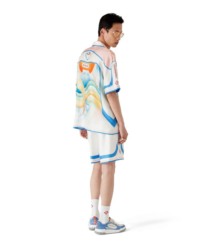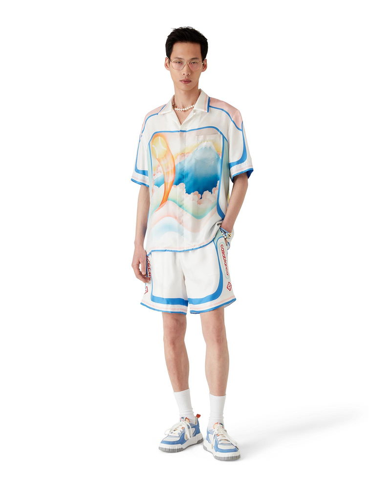 The Fuji Dream silk shorts are a printed design featuring artwork that showcases a dream-like vision of a trip to Mount Fuji - crafted from silk twill fabric. Completed with an elasticised waistband, in-seam side pockets, a back pocket, striped hem detail, and artwork down the sides. Printed silk twill fabric 100% silk Fuji Dream print multicolour Specialised dry clean only Made in Italy Relaxed fit The model is 187cm/6'1 and is wearing a size M Fuji Dream Silk Shorts, Size Small by Casablanca Paris
