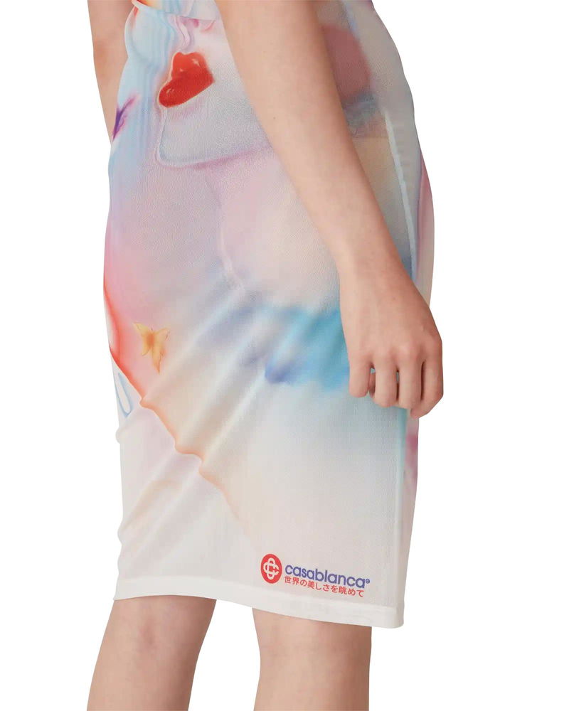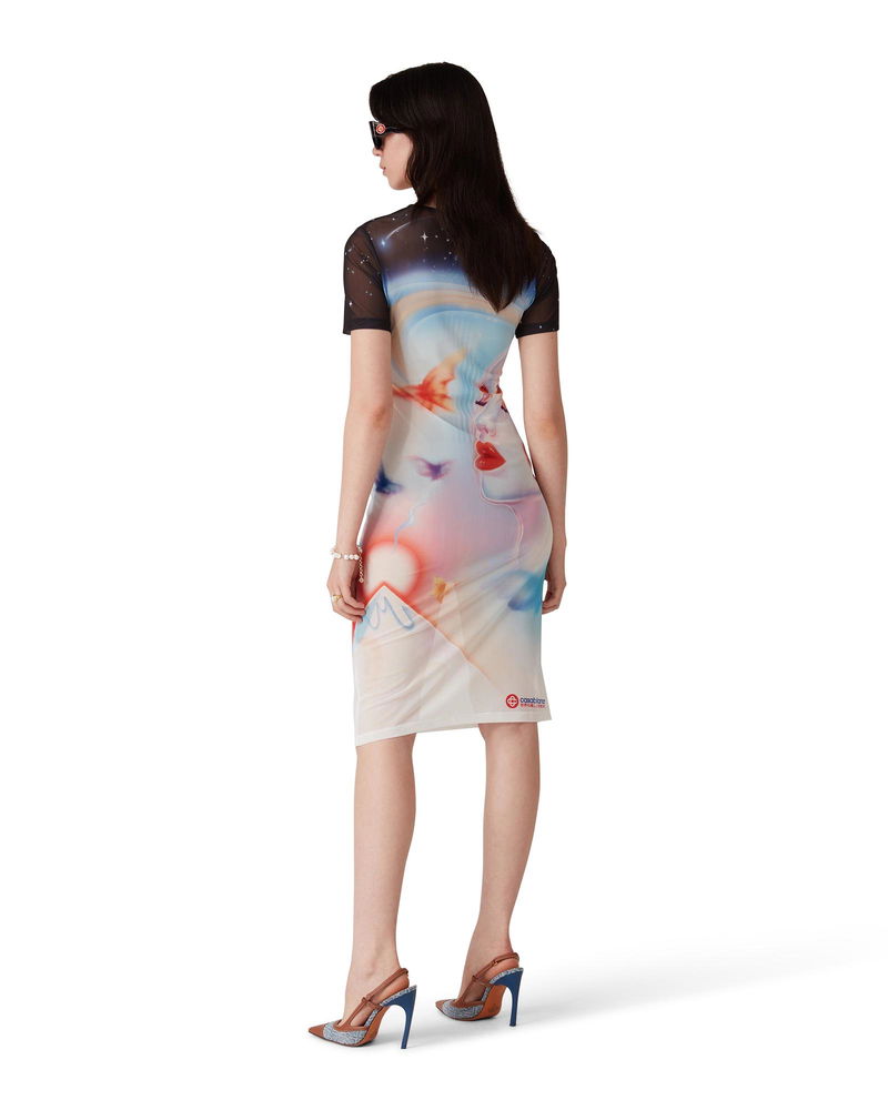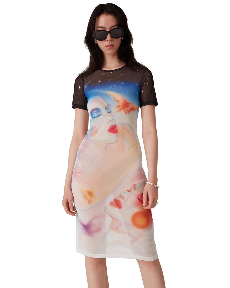The Galactic Connection mesh short-sleeve dress is a printed design crafted from a mesh fabric featuring the house's seasonal airbrush artwork - inspired by Pater Sato.