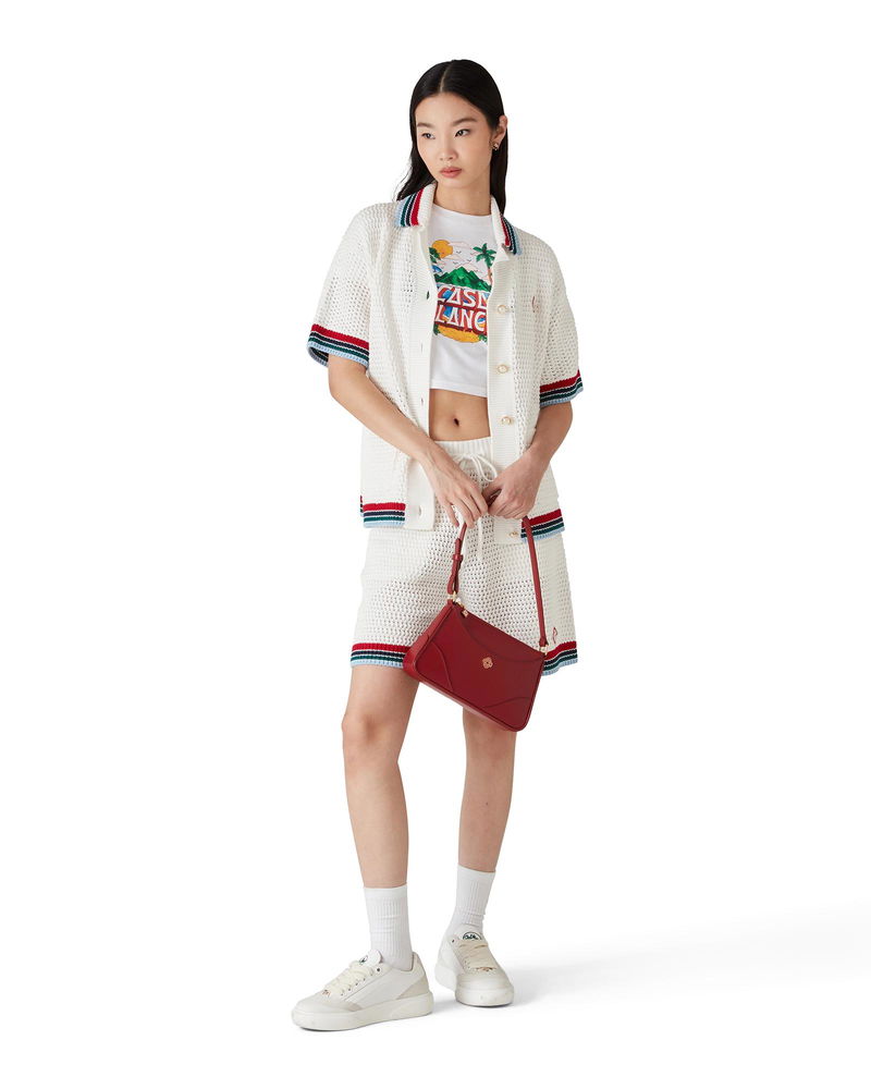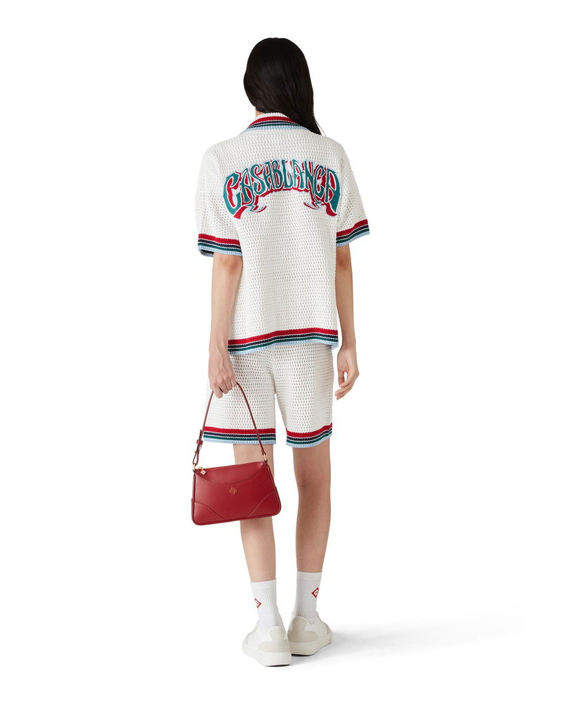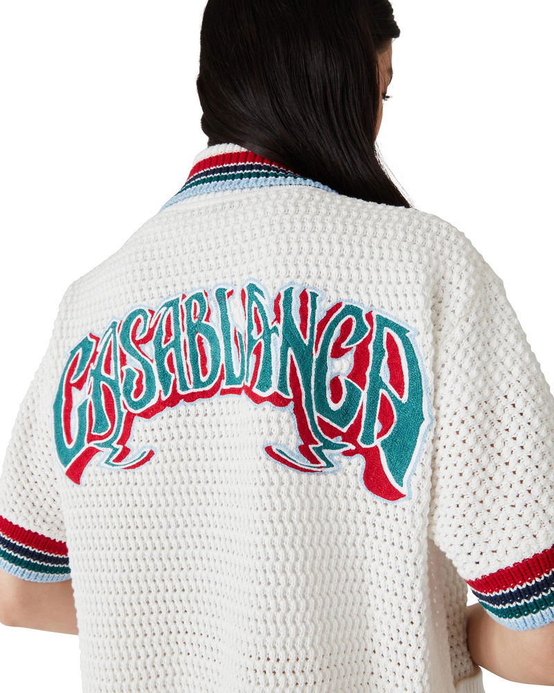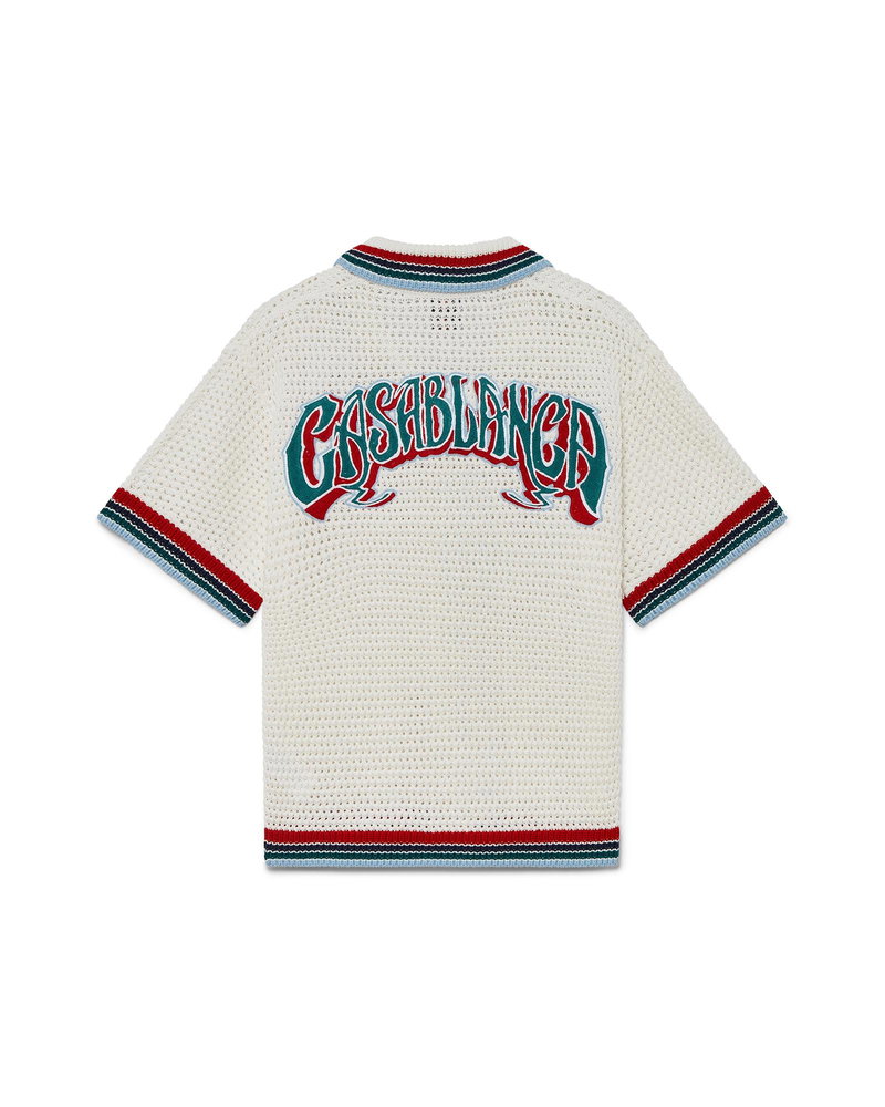 The gothic crochet shirt is a short-sleeve knitted design crafted from crochet cotton fabric and features the house's signature diamond logo. Completed with signature gold rim pearl buttons, front patch pockets, and striped edge detail on the collar, cuffs and hem.