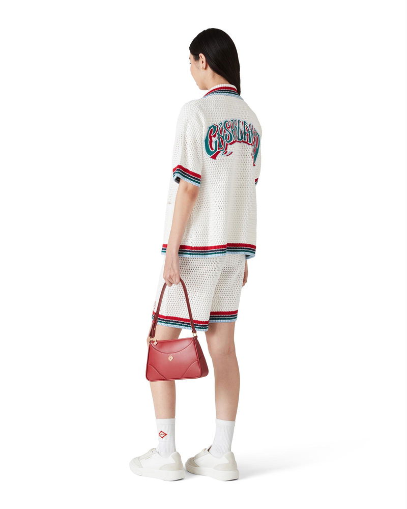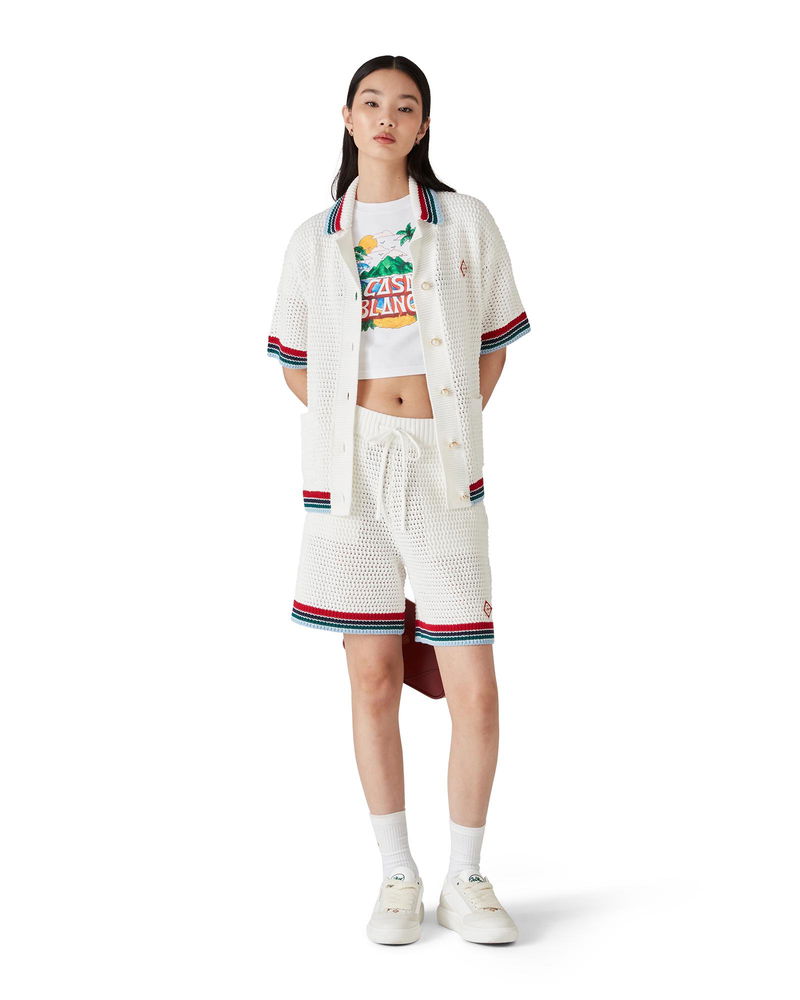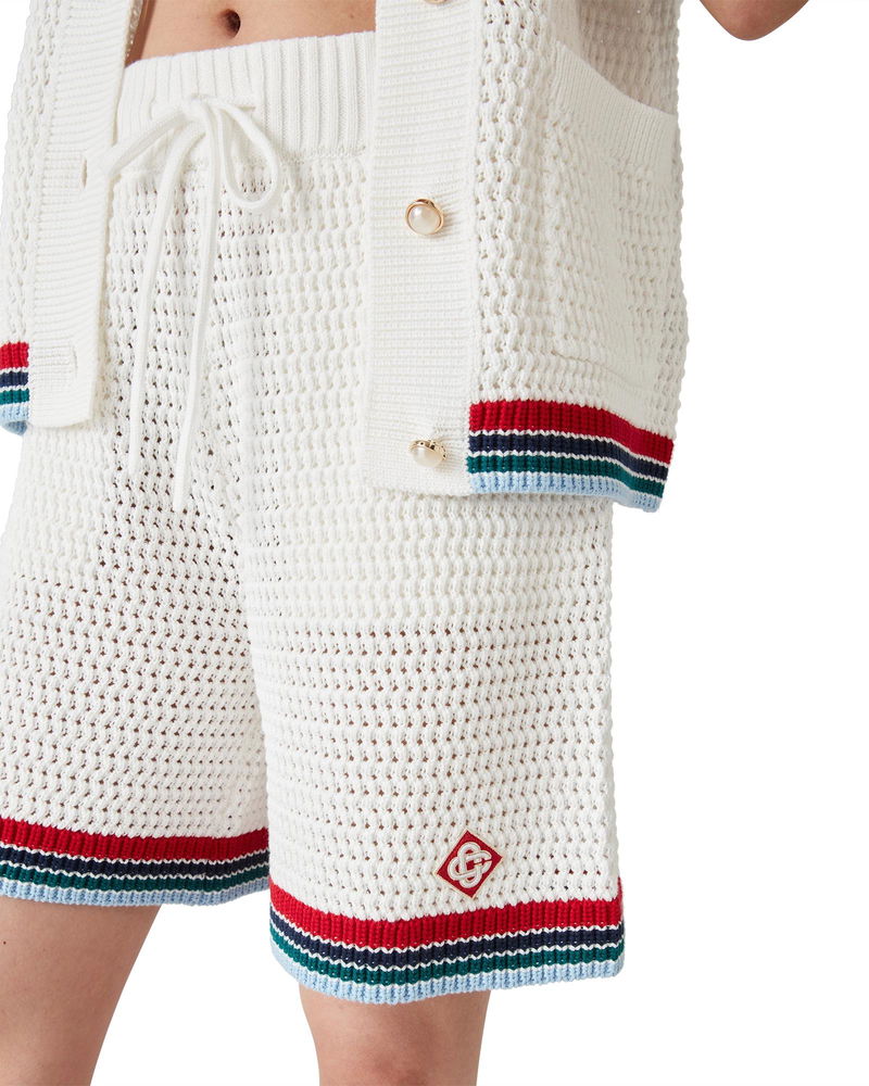 The gothic crochet shorts are a soft textured design crafted from knitted cotton fabric, featuring the house's signature diamond logo. Finished with a ribbed elasticated waistband with drawstring fastening, side pockets, and contrast stripe edge detail on the hem.