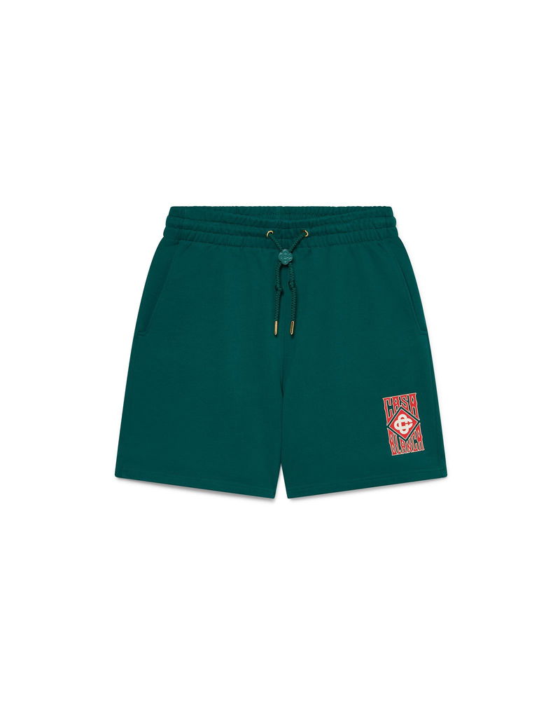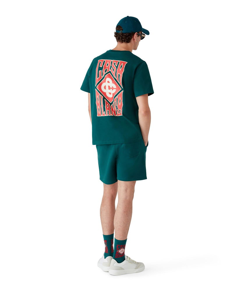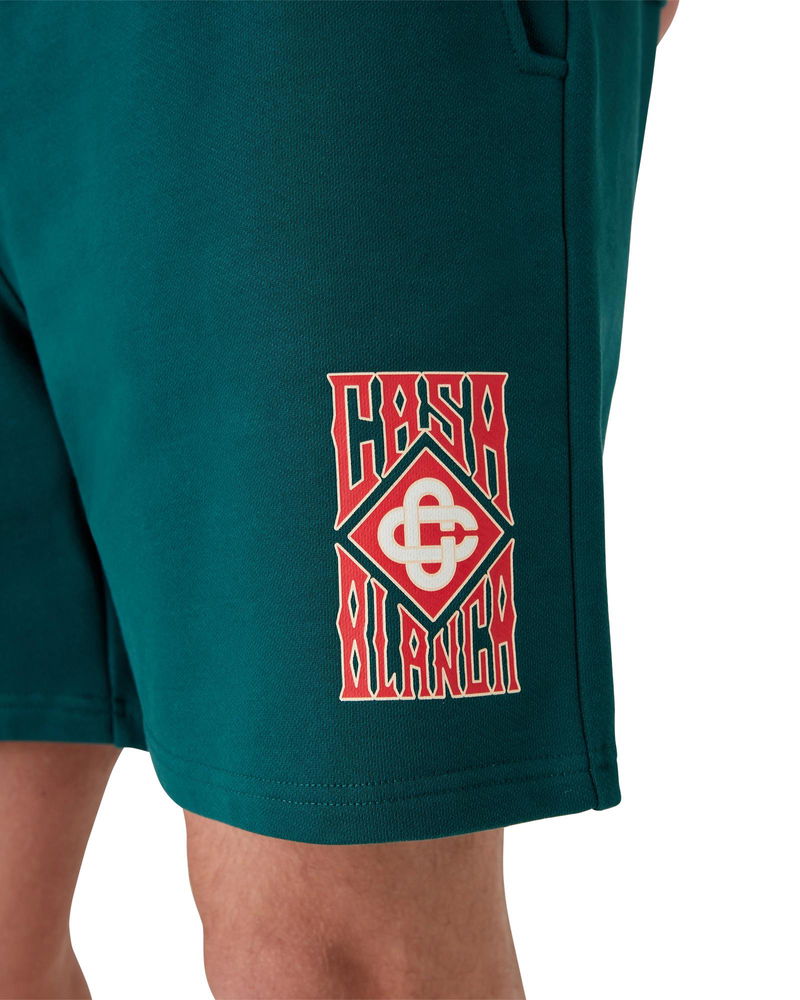 The Gothic Logo sweatshorts are a sportswear design crafted from organic cotton fabric and feature the gothic stacked logo with gothic typography inspired by LA street culture. Completed with an elasticated waistband, a gold-tipped drawstring fastening, slanted side pockets and a patch back pocket. Cotton loopback jersey fabric 100% cotton Colour: green Delicate machine wash Made in Portugal The model is 185cm/6'1 and is wearing a size M Gothic Logo Sweatshorts, Size Small by Casablanca Paris