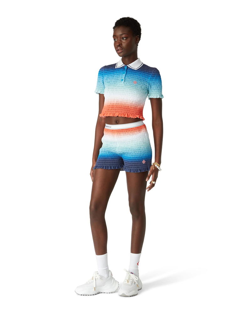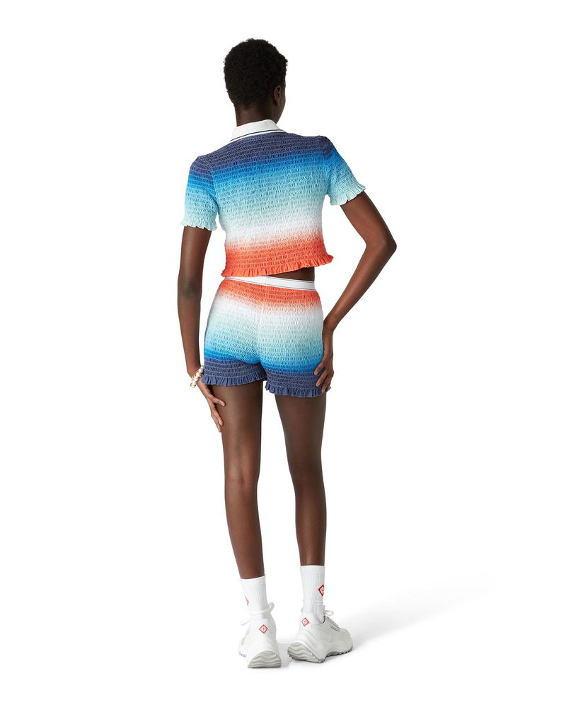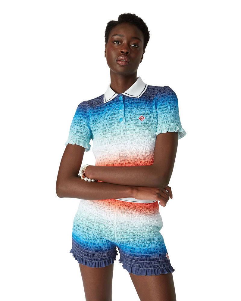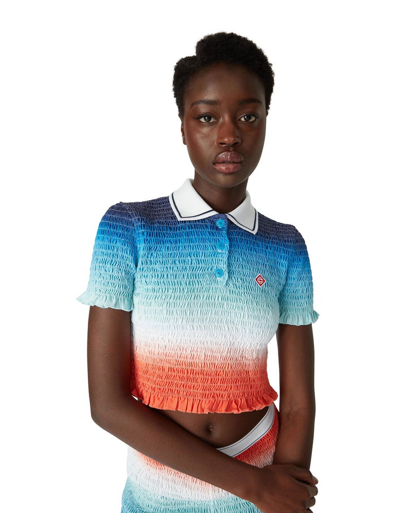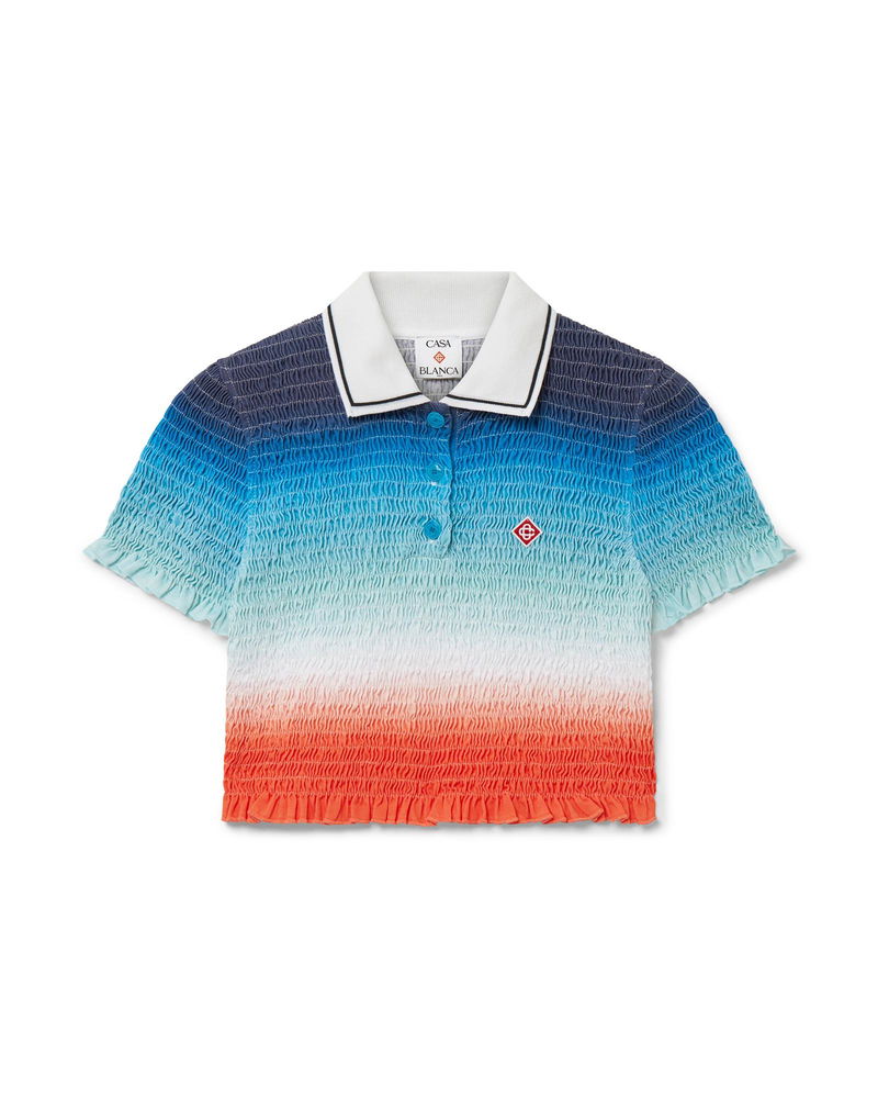 The gradient cropped polo shirt is an all-over printed short style featuring the house's seasonal vibrant gradient print of deep inky blues transitioning through shades of pink to vibrant orange, representing the summer's shifting sky, sinking into the ocean's horizon, alluding to nature's ever-changing canvas, and the house's signature diamond logo. Crafted from shirred cotton fabric and completed with a contrast collar with edge detail, three-button placket closure, short sleeves, and frill details on the cuffs and hem. Designed to fit above the navel. Gradient shirred cotton fabric.