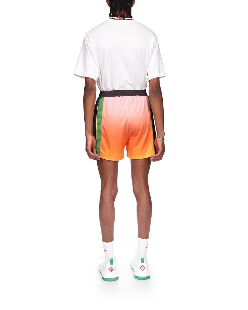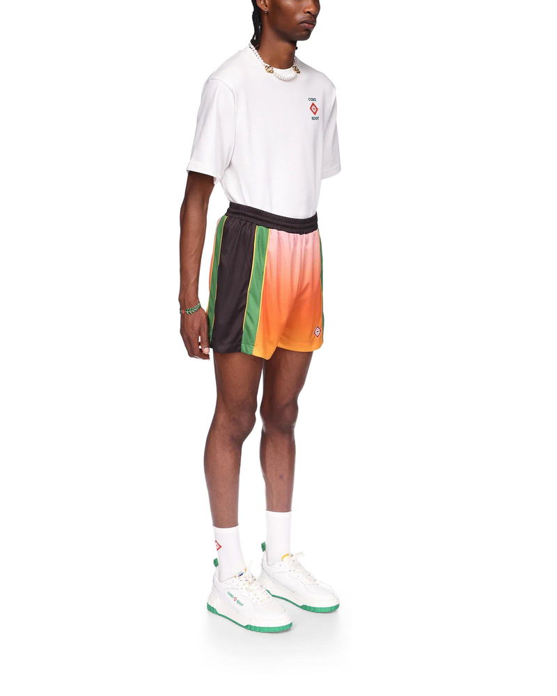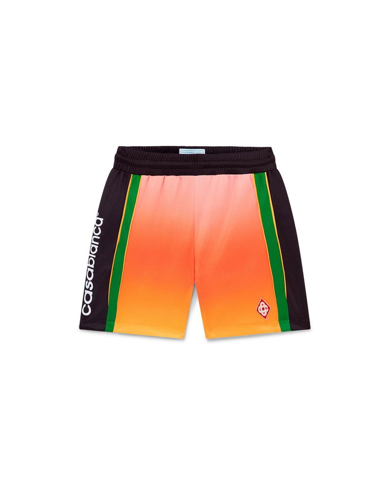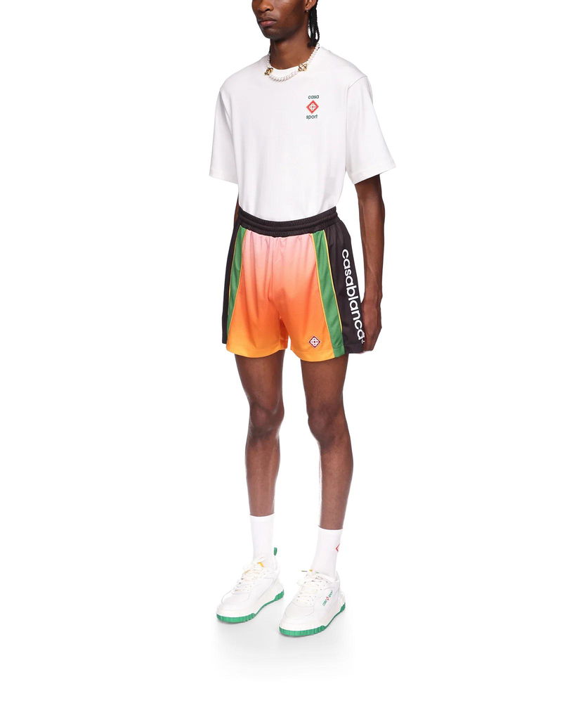 The Gradient Football shorts are a sportswear design crafted from a printed birdseye mesh fabric and feature a gradient series of colours representative of the rich exchanges across cultural disciplines in African art, music and film. Completed with an elasticated waistband, drawstring fastening, Casablanca logo down one leg, the house's signature diamond patch logo, side pockets and a back pocket. Printed birdseye mesh fabric Main: 100% polyester Applique: 95% rayon 5% polyester Colour: gradient multicolour Specialised dry clean only Made in Portugal The model is 186cm/6'1 and is wearing a size M Gradient Football Shorts, Size XS by Casablanca Paris