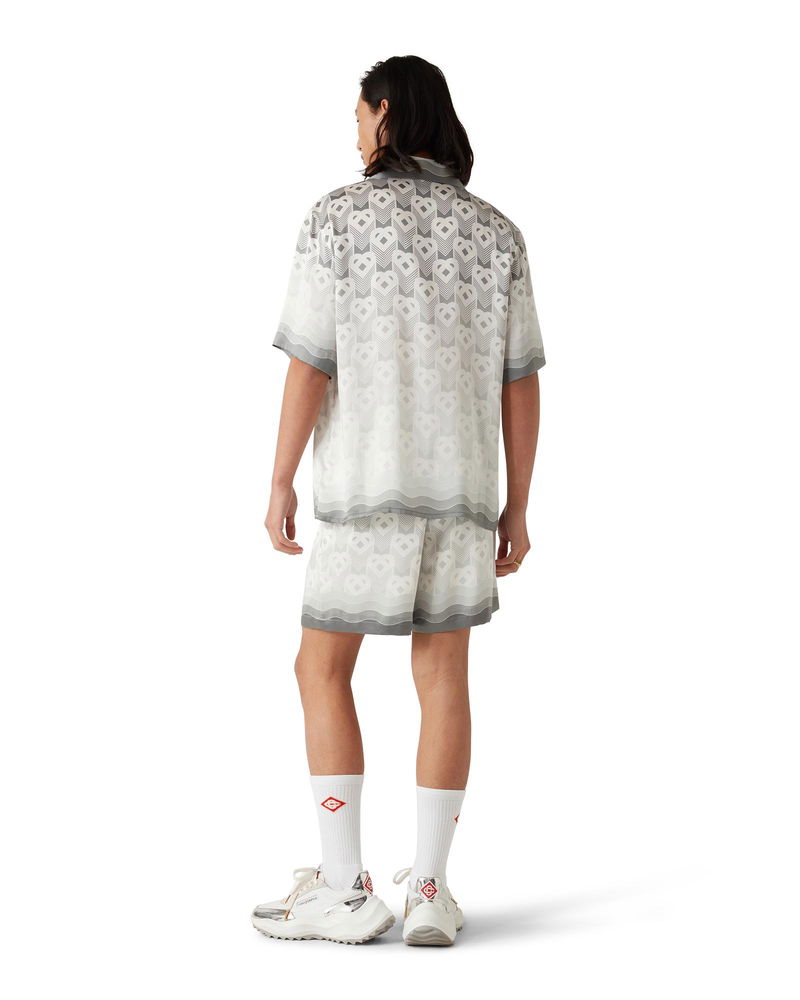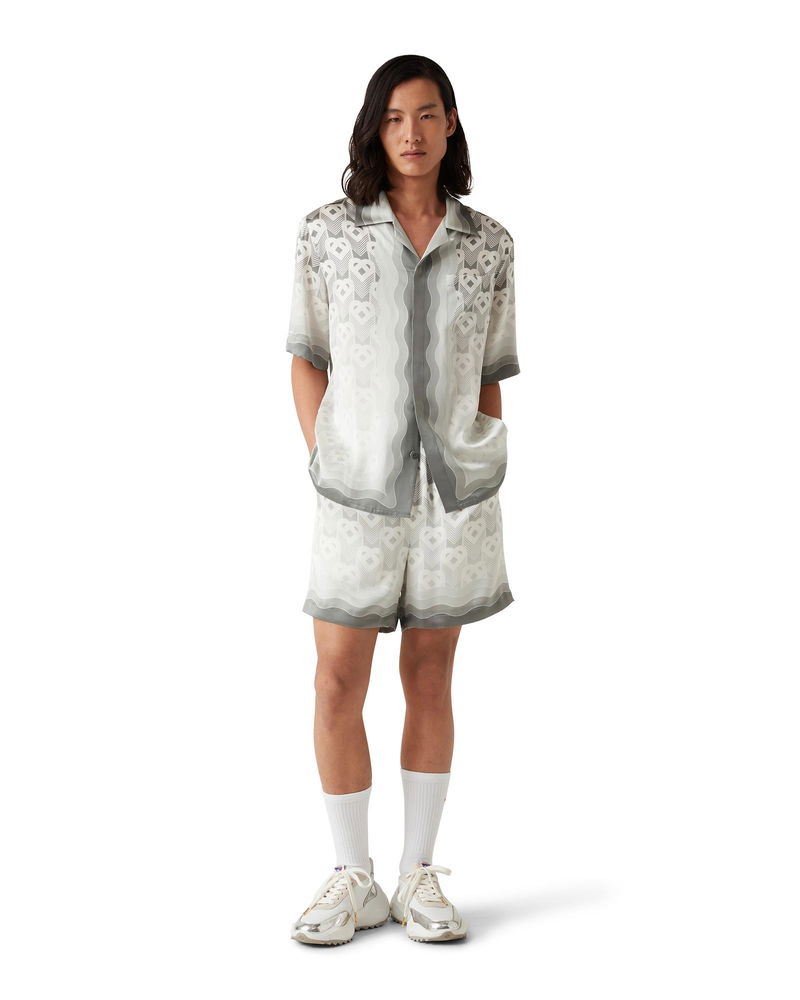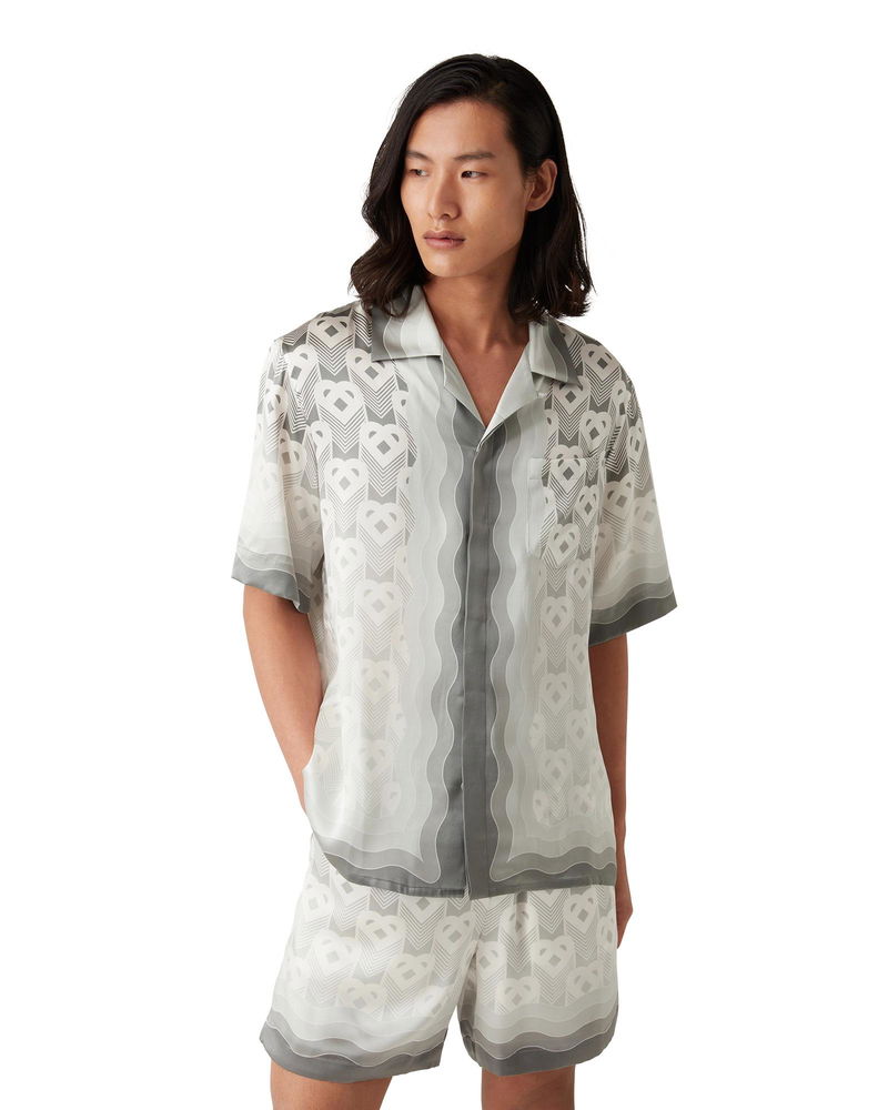 The Gradient Heart Monogram silk shirt is an all-over printed design featuring the house's heart monogram on this season's silver gradient background. Crafted from a monogram silk satin fabric and finished with a collar, a breast pocket, and collar, cuffs, hem and placket with gradient Memphis wave-inspired detail. Printed silk satin fabric 100% silk Grey Gradient Heart monogram print Specialised dry clean only Made in Italy Fits true to size, take your regular size The model is 187cm/6'1 and is wearing a size M Gradient Heart Monogram Short Sleeve Silk Shirt, Size XXS by Casablanca Paris