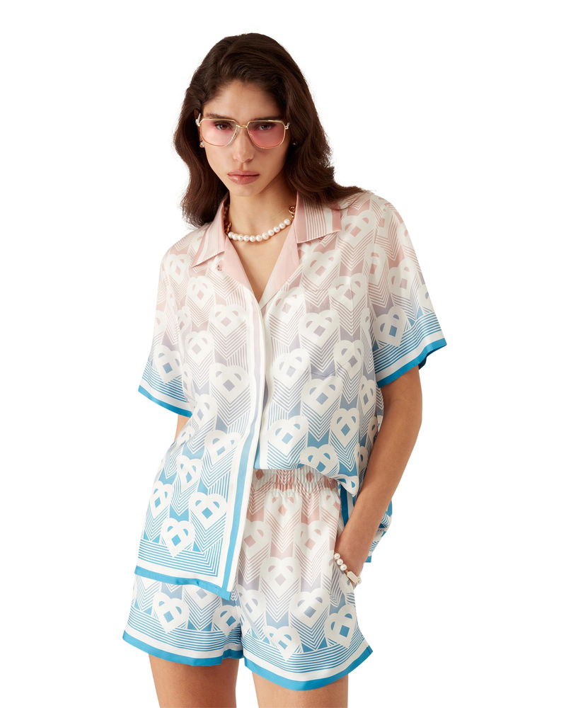 The Gradient Heart monogram silk shorts are an all-over printed design featuring the house's heart monogram on a pink and blue gradient background. Crafted from a monogram silk twill fabric and finished with an elasticised waistband, drawstring fastening, a back pocket and stripe hem detail.