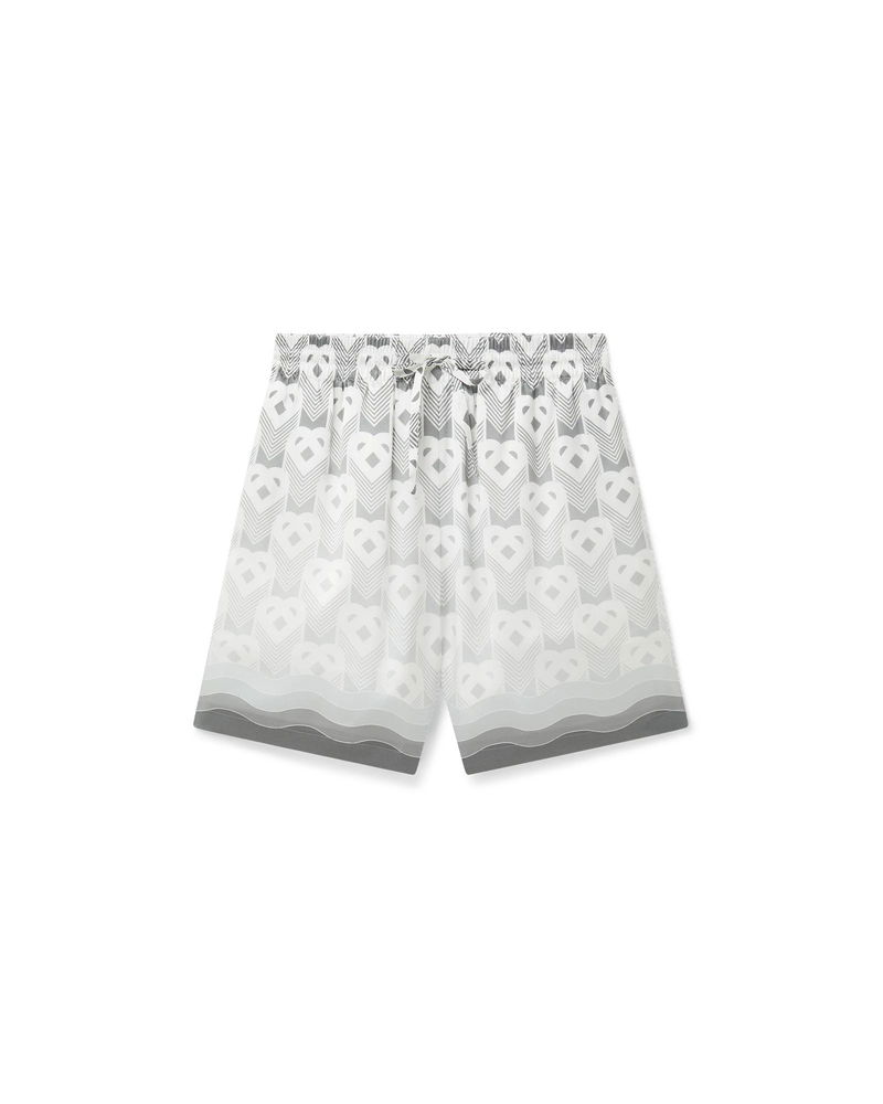 The Gradient Heart Monogram silk shorts are an all-over printed design featuring the house's heart monogram on this season's silver gradient background. Crafted from a monogram silk satin fabric and finished with an elasticated waistband, drawstring fastening, in-seam side pockets, a back patch pocket, and gradient Memphis wave inspired hem detail. Printed silk satin fabric 100% silk Grey Gradient Heart monogram print Specialised dry clean only Made in Italy Fits true to size, take your regular size Model is 187cm/6'1 and is wearing a size M Gradient Heart Monogram Silk Shorts, Size Medium by Casablanca Paris