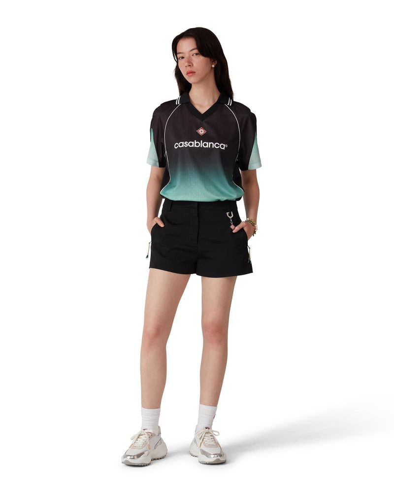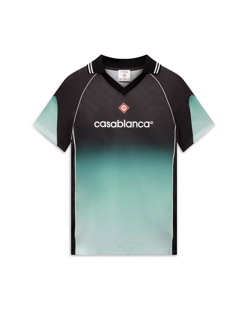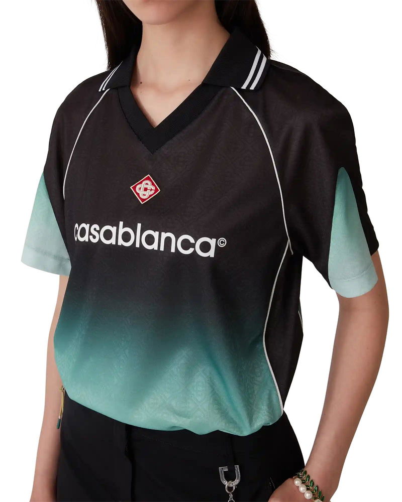 The gradient monogram jacquard football shirt is a short-sleeve design using the Park Hyatt colourway - an iconic Tokyo hotel that uses mint and black in its interior design - crafted from gradient jacquard monogram fabric. Completed with the house's signature diamond logo patch, a rib collar, and a Casablanca logo across the chest. Jacquard monogram fabric Main: 100% polyester Colour: gradient green/black Delicate machine wash Made in Portugal Relaxed fit The model is 177cm/5'9.5 and is wearing a size S Gradient Monogram Jacquard Football Short Sleeve Shirt in Black, Size XXS by Casablanca Paris