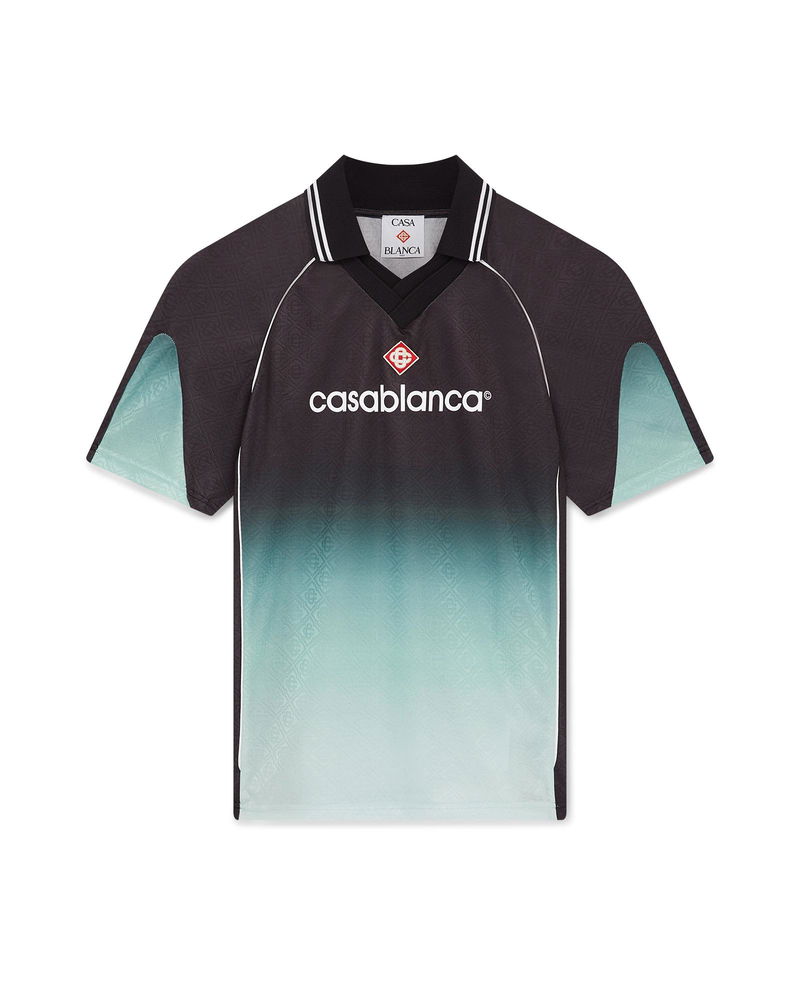 The jacquard gradient football shirt is a short-sleeve design using the Park Hyatt colourway - an iconic Tokyo hotel that uses mint and black in its interior design - crafted from gradient jacquard monogram fabric. Completed with the house's signature diamond logo patch, a rib collar, and a Casablanca logo across the chest. Jacquard monogram fabric Main: 100% polyester Colour: gradient green/black Delicate machine wash Made in Portugal Relaxed fit The model is 187cm/6'1 and is wearing a size M Gradient Monogram Jacquard Short Sleeve Football Shirt in Black, Size XS by Casablanca Paris