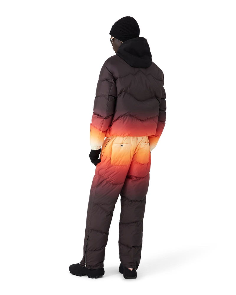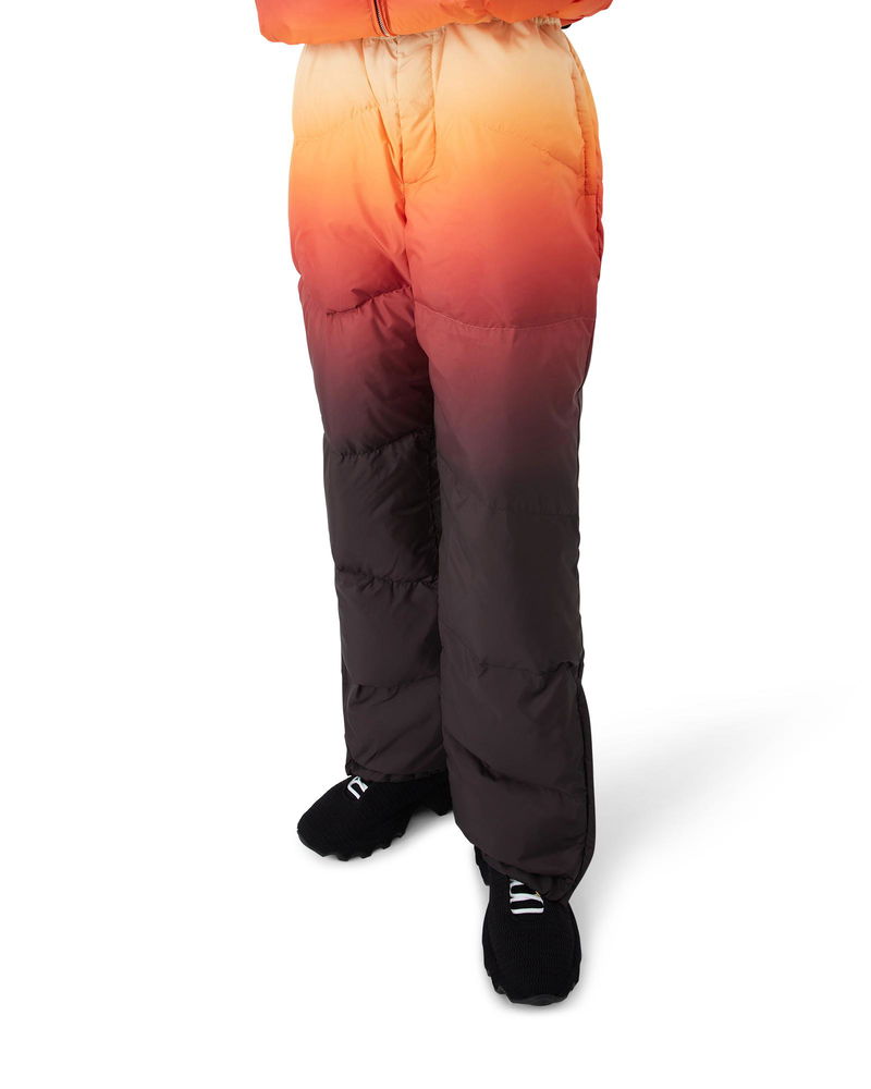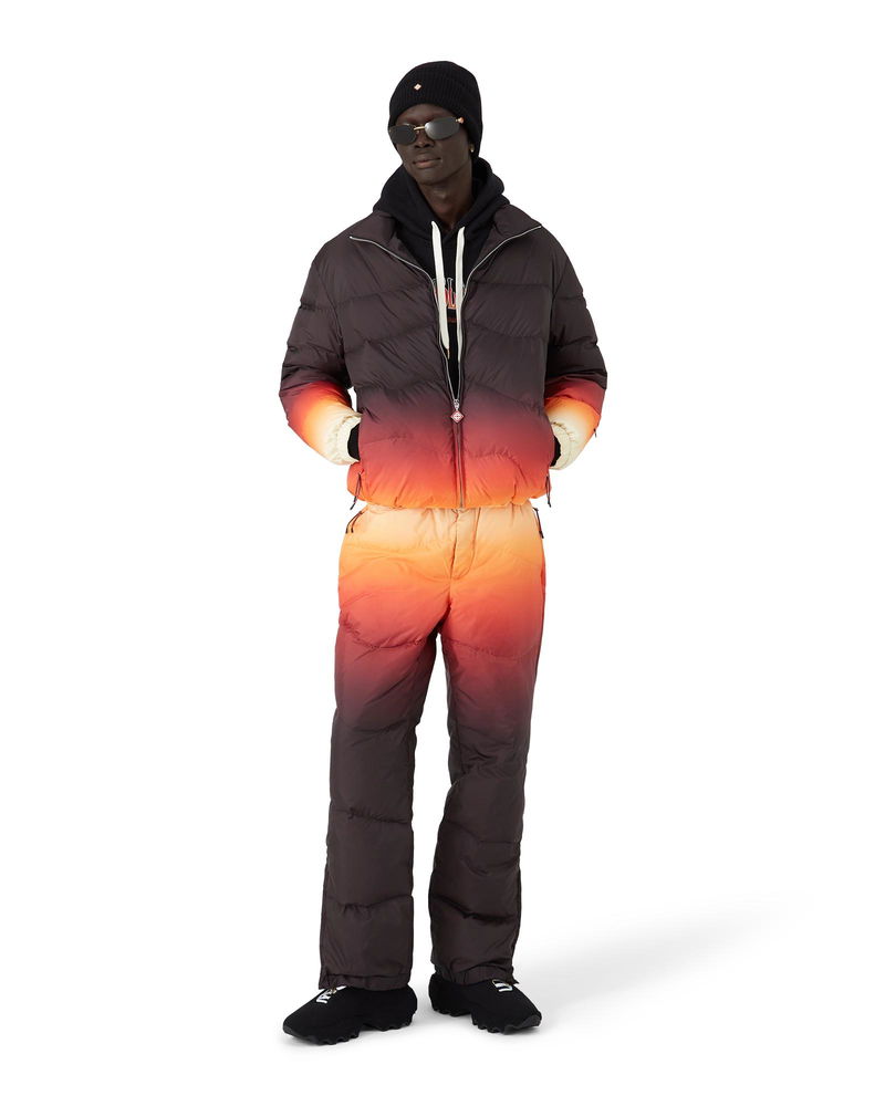 The ski trousers are a refined après-sport design crafted from gradient printed down fabric, featuring a multicolour gradient inspired by spectacular alpenglow illuminating Japan's mountainous countryside. Evoking the magical transition when pink and purple hues wash across snow-covered peaks and rural valleys glow with last light. Completed with elasticated front closure, side pockets with zip closure and back pockets adorned with silver-plated hardware, and zip closure at the ankles. Gradient printed down fabric Main: 100% polyester Lining: 96% polyester Padding: 80% down 20% feather Colour: gradient multicolour print Specialised dry clean only Made in Italy Relaxed fit The model is 187cm/6'1 and is wearing a size M Exclusive to casablancaparis. com, Paris Flagship store and selected retailers Gradient Nylon Down Padded Trousers in Pink, Size XS by Casablanca Paris