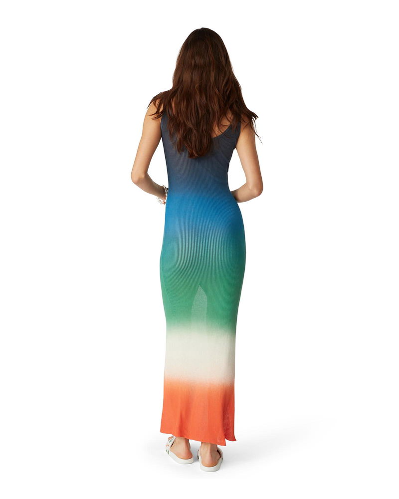 The gradient rib dress is a printed sleeveless design featuring the house's seasonal vibrant gradient print of deep inky blues transitioning through shades of pink to vibrant orange, representing the summer's shifting sky, sinking into the ocean's horizon, alluding to nature's ever-changing canvas.