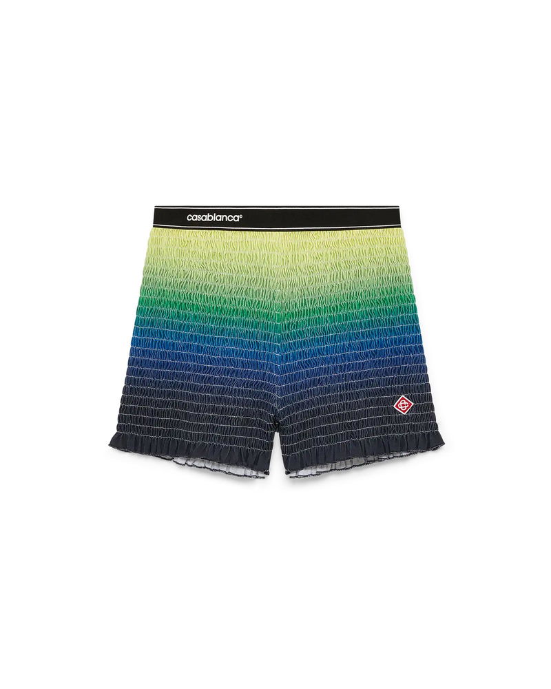 The gradient shirred shorts are a cropped style featuring the season's gradient colourway, and the house's signature diamond logo. Completed with an elasticised tape waistband featuring the Casablanca logo and edge detail, and frill details on the hem.