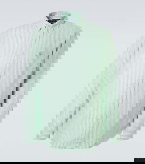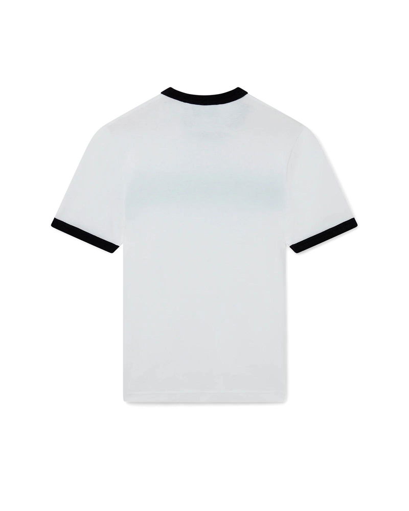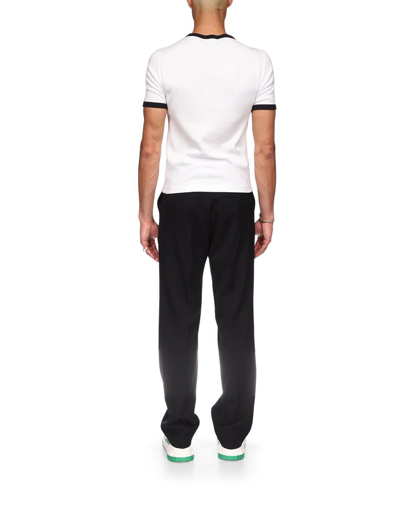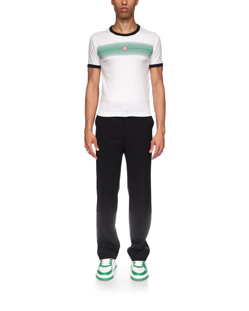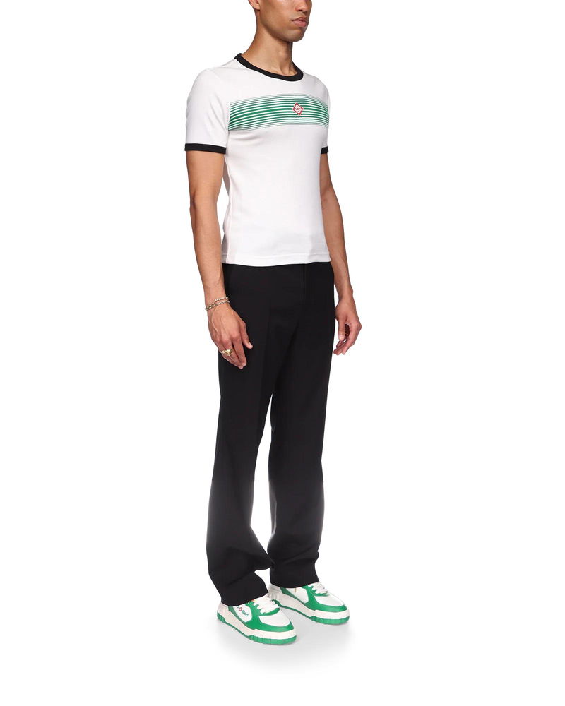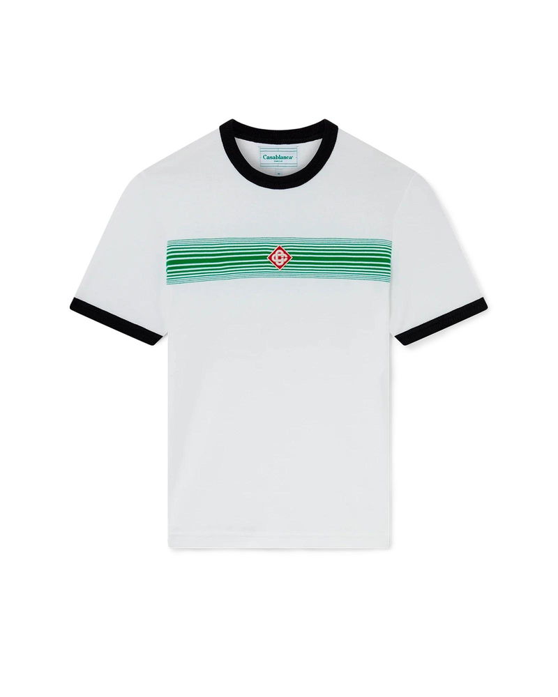 The Gradient Stripe ringer t-shirt is a fitted design inspired by the colours of the Nigerian flag and featuring the house's diamond logo appliqué. Crafted from an organic cotton fabric and finished with a classic crew neck, with a contrast rib collar and cuffs. 100% organic cotton Colour: green and white Delicate machine wash Made in Portugal Fits small to size, you may wish to take a size up The model is 187cm/6'1 and is wearing a size M Gradient Stripe Ringer Short Sleeve T-Shirt in Green, Size XS by Casablanca Paris