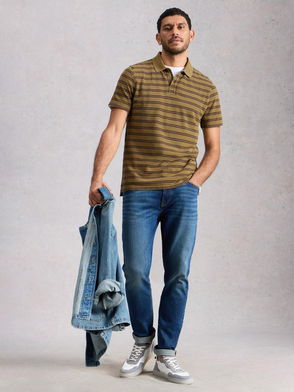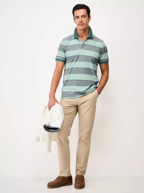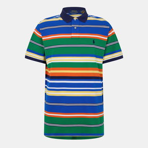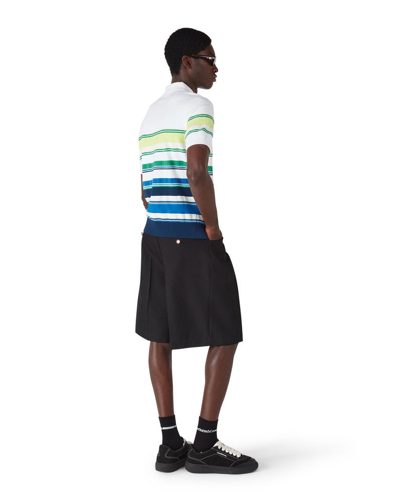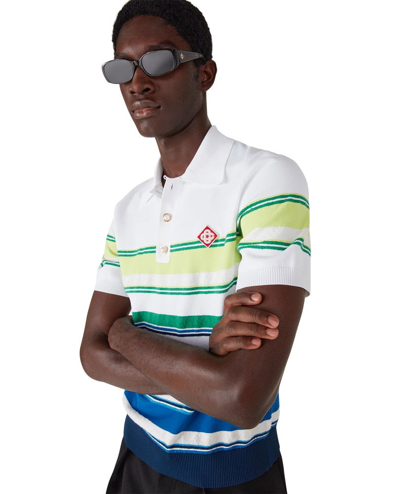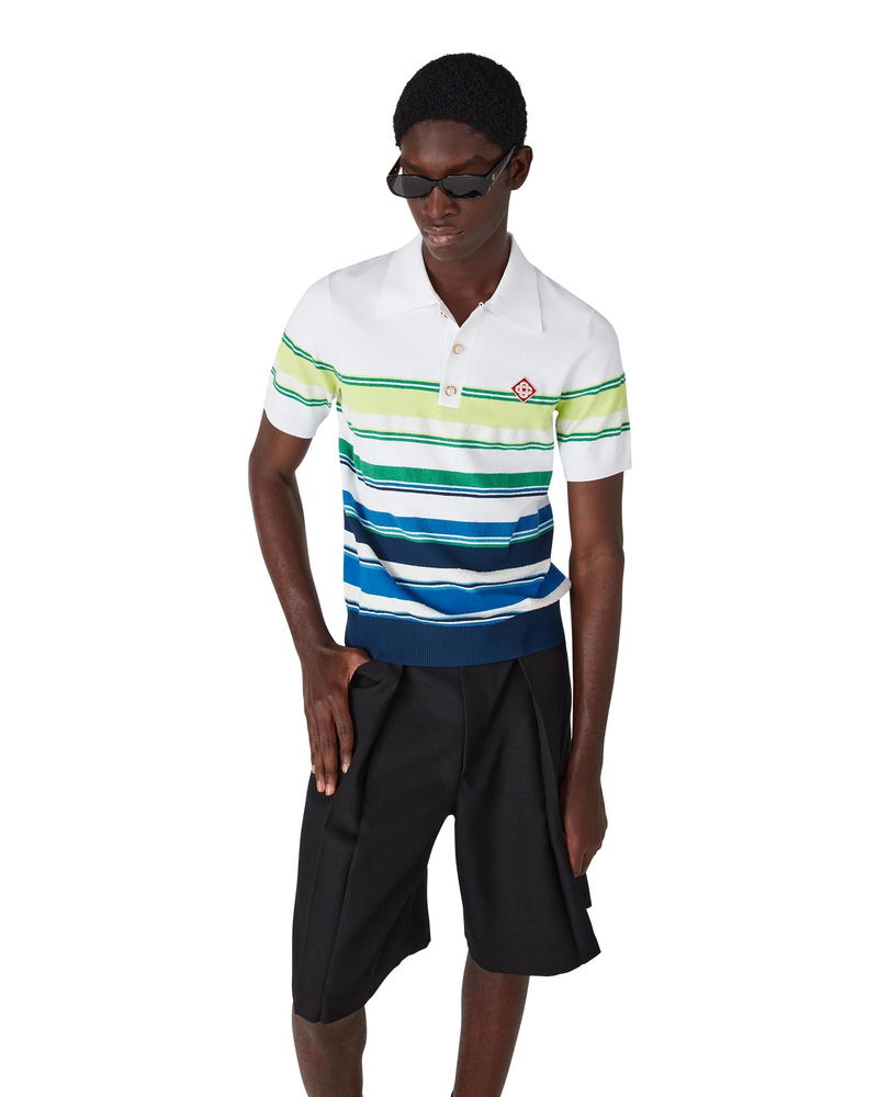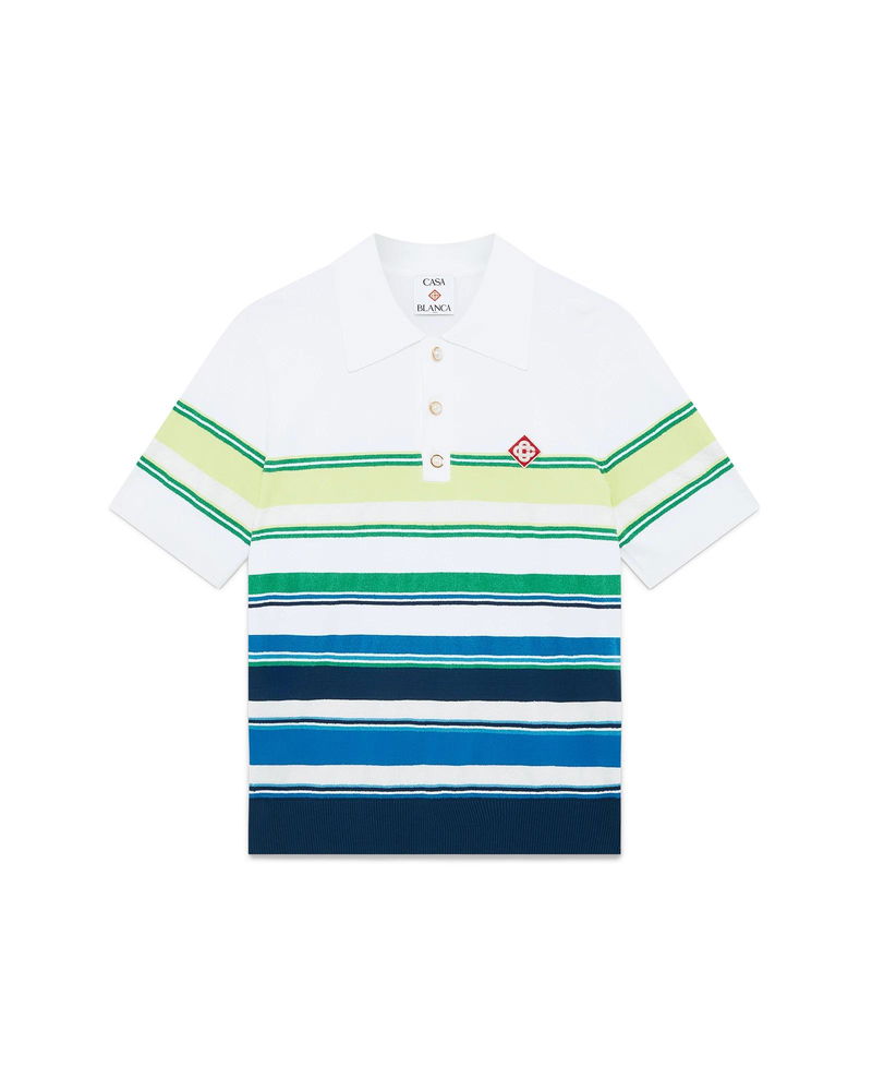 The gradient striped polo shirt is a refined knitted design crafted from viscose featuring the house's signature diamond logo. Completed with a ribbed collar, cuffs, hem, and placket, stripe detailing throughout the bodice, and a classic three-button placket with signature gold rim pearl buttons. Technical fabric 61% viscose 17% cotton 12% polyester 10% polyamide Colour: white/blue/green Delicate machine wash Made in China Relaxed fit The model is 189cm / 6'2 and is wearing size M Exclusive to casablancaparis. com, our flagship stores and selected retailers Gradient Stripe Short Sleeve Polo Shirt, Size XS by Casablanca Paris