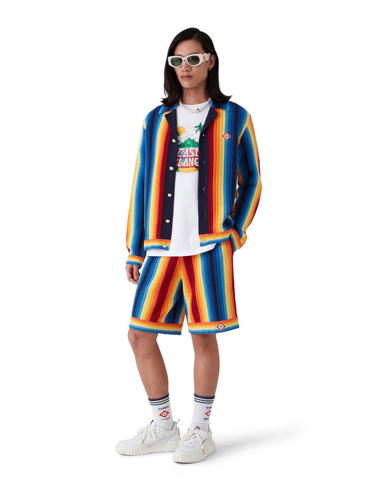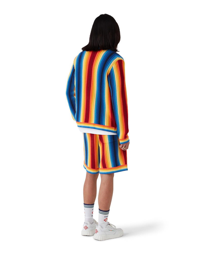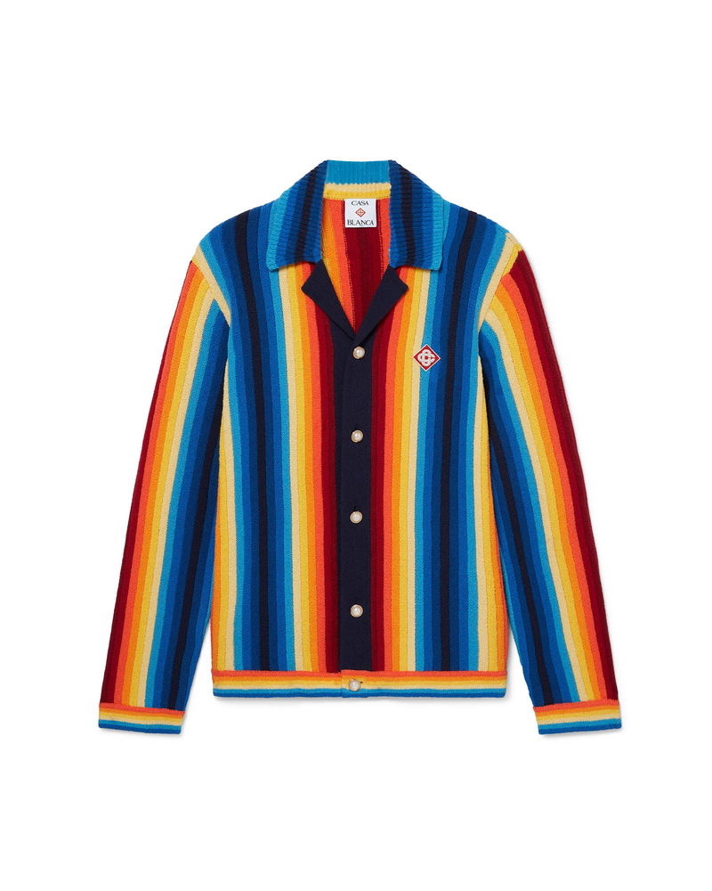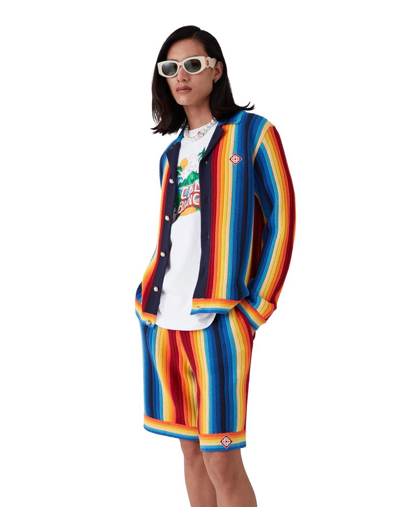 The Gradient Stripe towelling jacket is a long-sleeve design crafted from knitted gradient towelling fabric. Completed with button closure, signature gold rim pearl buttons, and rib collar, cuffs, and hem detail. Knitted gradient towelling fabric Main: 65% cotton 35% polyamide Applique: 95% viscose 5% polyester Colour: multicolour Specialised dry clean only The model is 187cm/6'1 and is wearing a size M Made in China Gradient Stripe Towelling Jacket, Size XS by Casablanca Paris