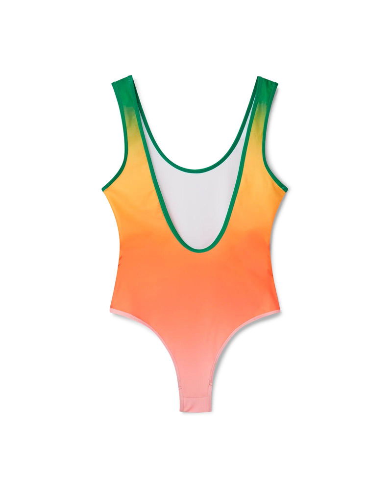 The gradient printed swimsuit is a refined one-piece design featuring a gradient multicolour reflecting the house's elevated approach to swim codes.