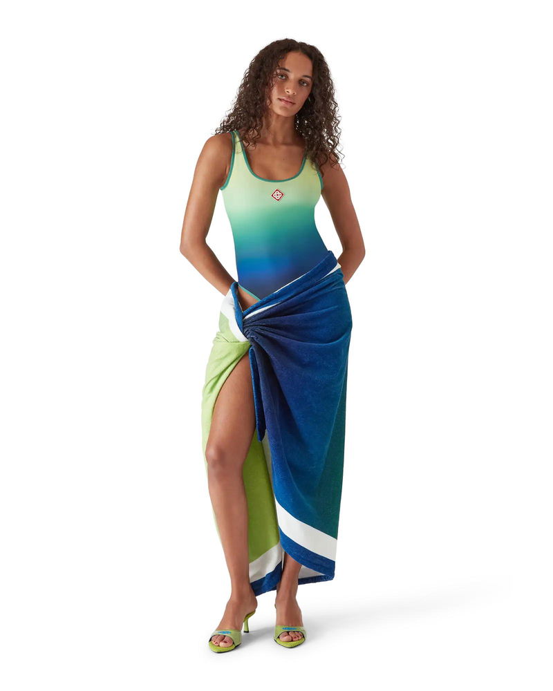 The gradient printed swimsuit is a refined printed design, crafted from a breathable technical swim fabric, featuring the season's gradient colourway. Completed with the house's signature diamond logo on the chest, high-cut legs, a scoop neck, a deep scoop back, and contrast edge detail.