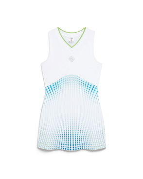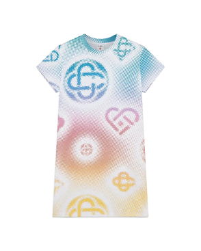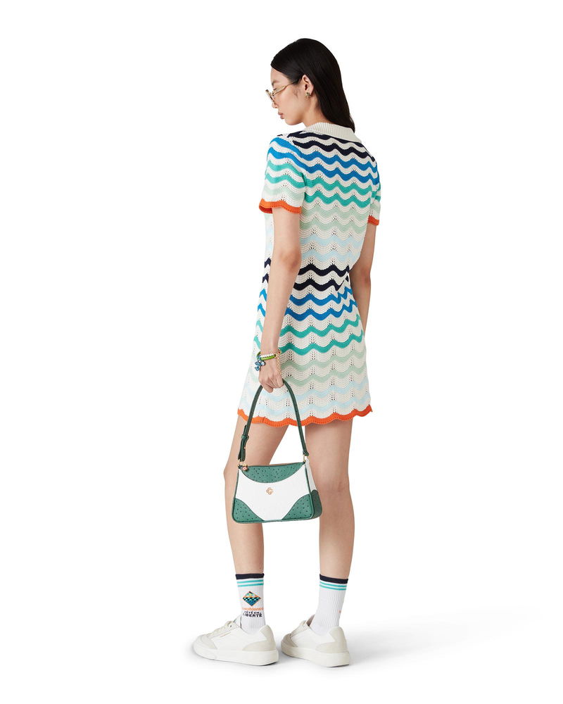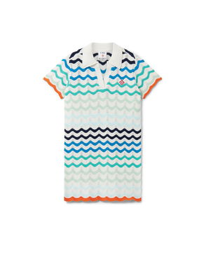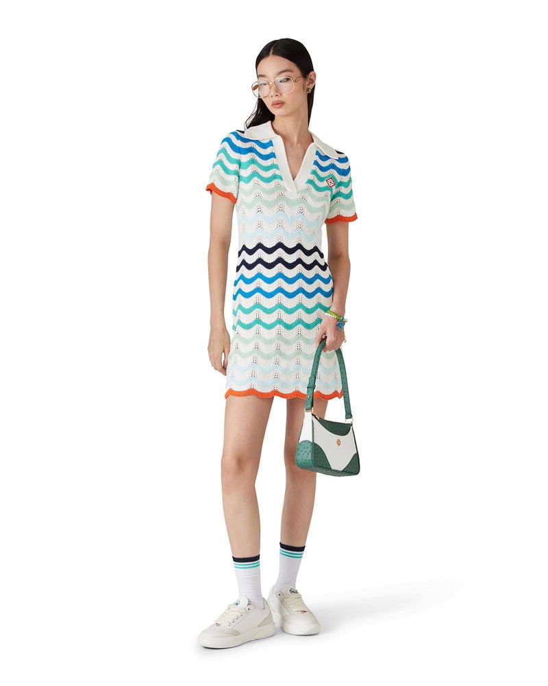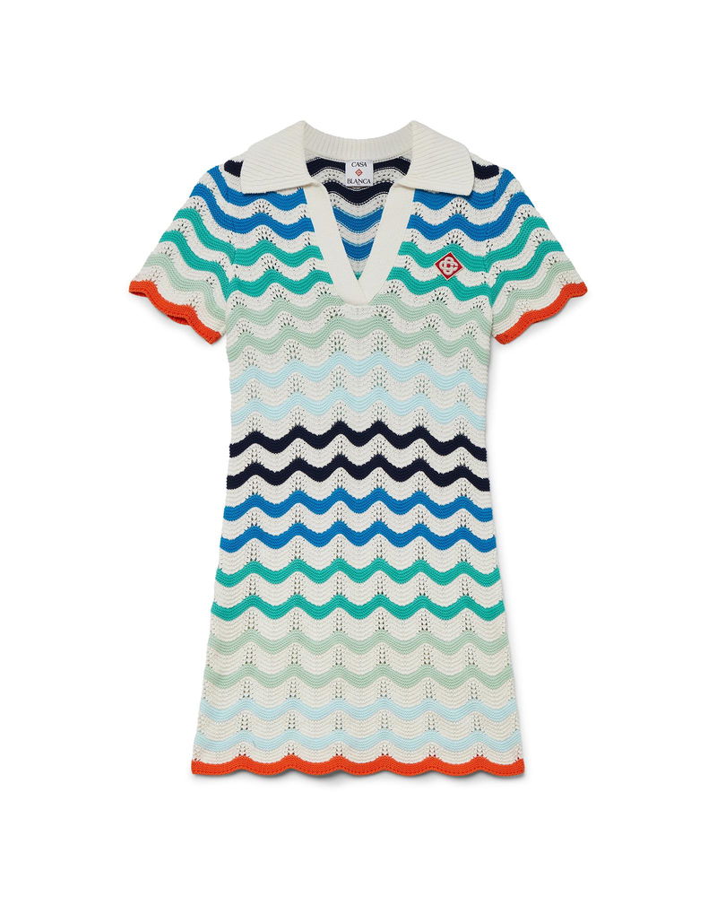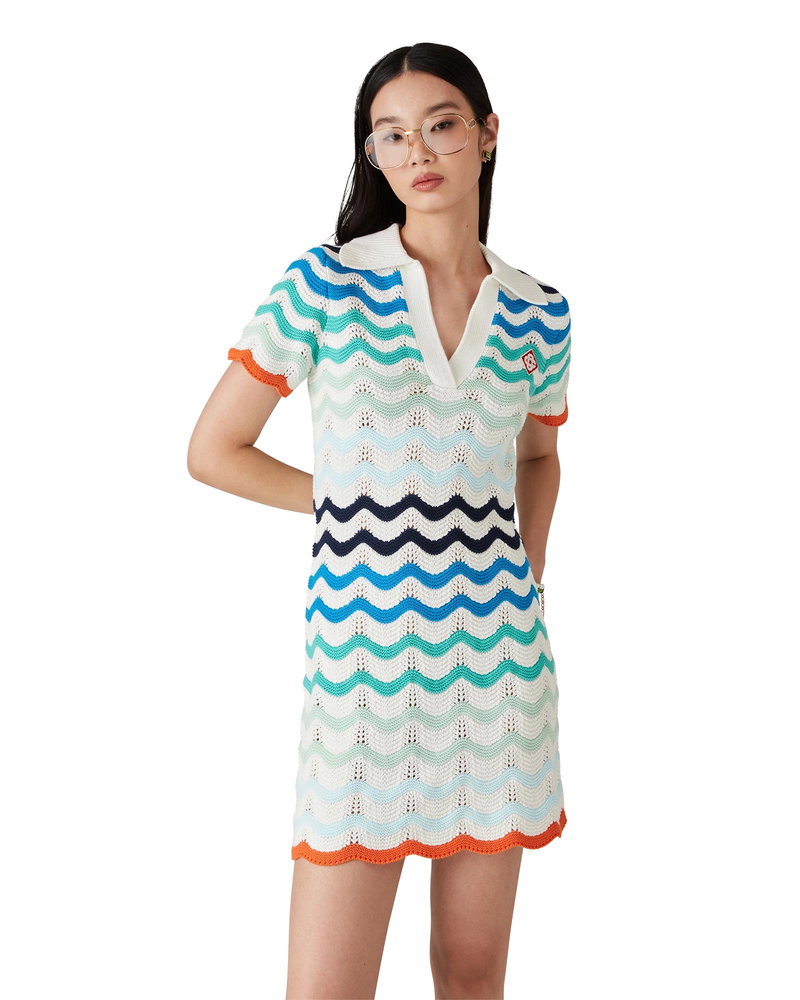 The Gradient Wave crochet dress is a short-sleeve mini design crafted from crochet cotton fabric featuring the house's Memphis wave-inspired design element in gradient colours.