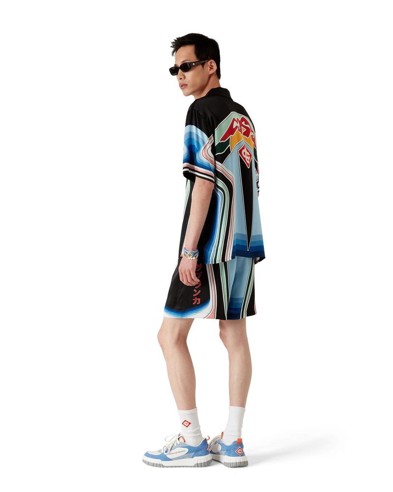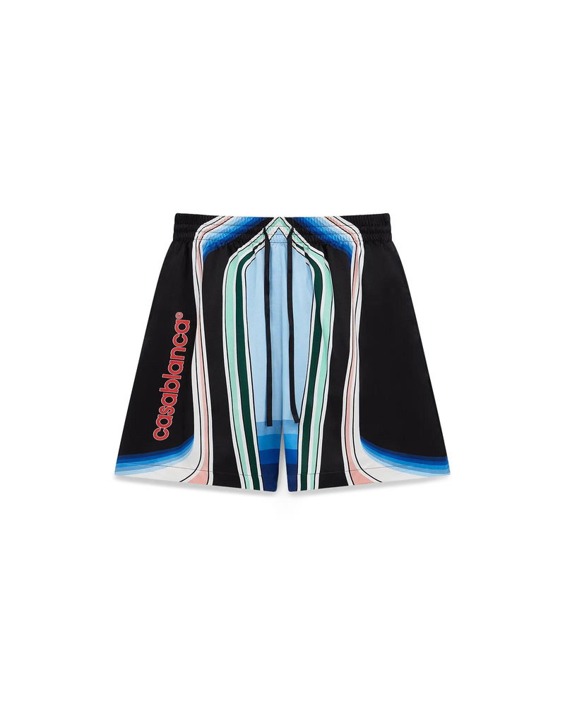 The Graphic Mountain silk shorts are an all-over printed design crafted from silk satin fabric. Completed with an elasticised waistband, drawstring fastening, in-seam side pockets, and a back pocket. Printed silk satin fabric 100% silk Graphic Mountain print multicolour Specialised dry clean only Made in Italy Relaxed fit The model is 187cm/6'1 and is wearing a size M Graphic Mountain Silk Shorts, Size XS by Casablanca Paris