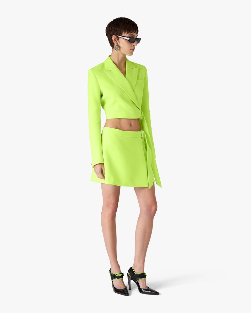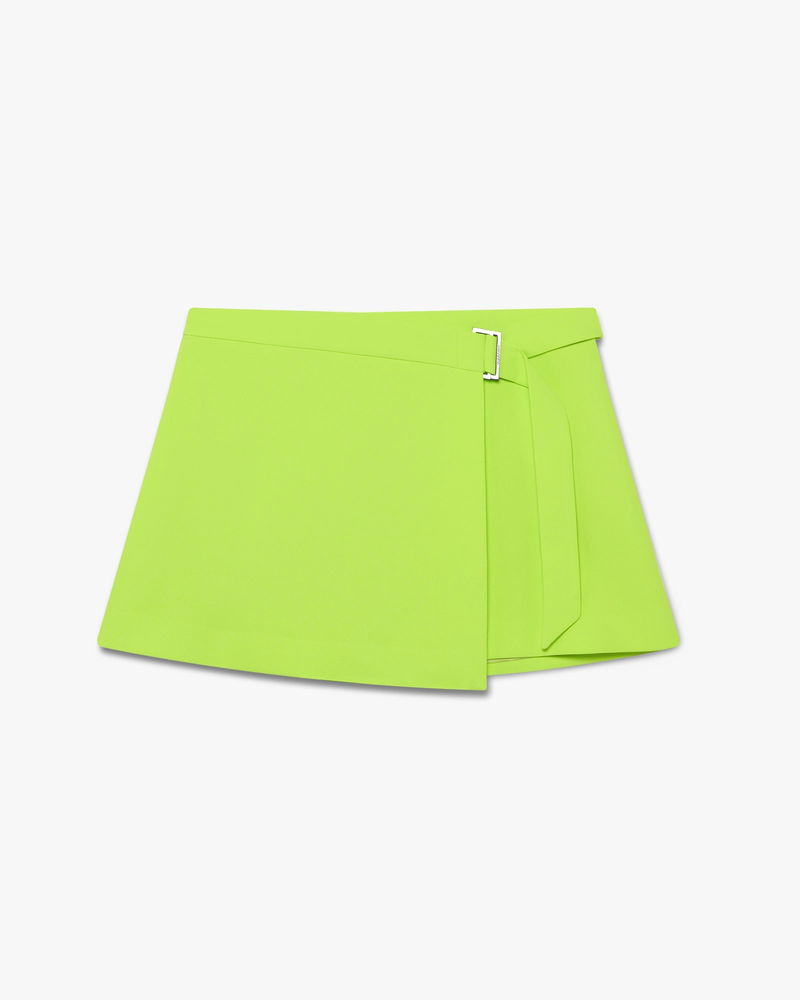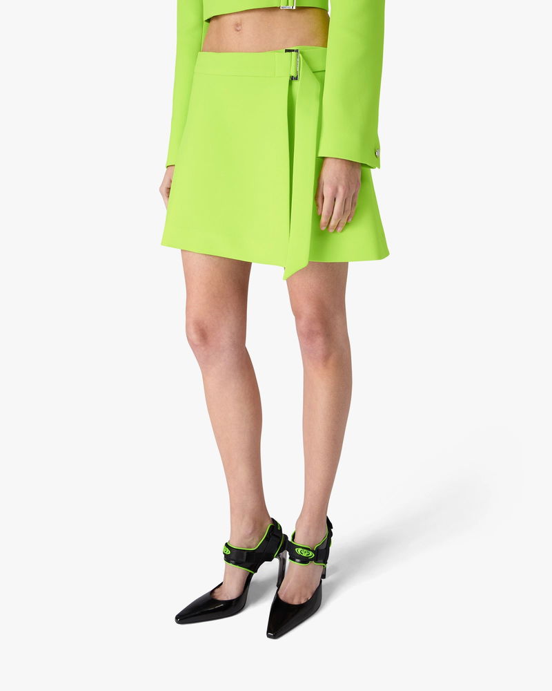 The green crepe mini skirt is a refined A-line cross-over design in a vibrant green hue. Completed with a structured waistband, a belt fastening, and a silver-plated buckle.